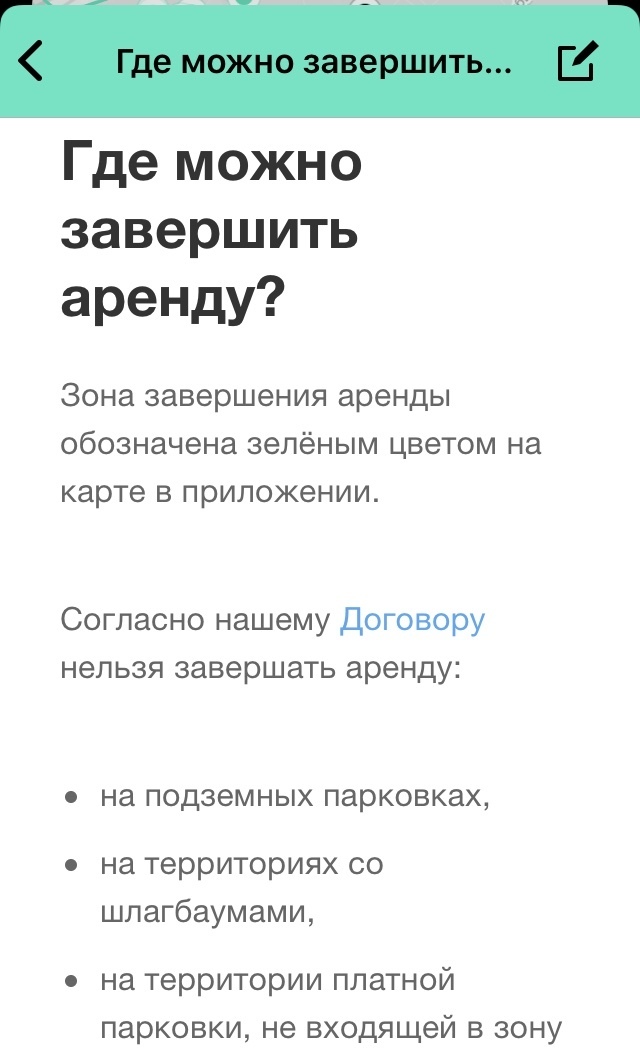 пункт 1. Движение, оставление ТС (остановка, стоянка, в т.ч. в режиме «Ожидание» или при окончании Сессии аренды) допускается только с соблюдением требований, установленных законодательством, в т.ч. ПДД, а также Договором (приложениями к нему), на местах, где допускается остановка (для остановки) или стоянка (для стоянки) легковых ТС, бесплатная парковка (стоянка) без ограничений (в т.ч. по категории ТС или по времени) в соответствии с ПДД, на платных парковках для легковых ТС, входящих в зону платной городской парковки, определенной Постановлением Правительства Москвы от 17.05.2013 г. № 289-ПП «Об организации платных городских парковок в городе Москве». Оставление (остановка, стоянка) ТС в любом случае не допускается с нарушением правил ПДД, на подземных парковках, на тротуарах, на территории закрытой или специализированной парковки, на территории частной парковки, на территории, для доступа в которую необходимо разрешение, равно как на территориях с ограниченным доступом (в т.ч. оснащенные ограничивающими свободный въезд/выезд устройствами), на местах, где остановка / стоянка (бесплатная остановка / стоянка) допускается временно (в определенные часы, дни), в местах, где по данным Арендодателя отсутствует или затруднен доступ к системе ГЛОНАСС/GPS и(или) к сети Интернет, и(или) мобильной связи, на парковочных местах для инвалидов, для грузовых ТС, на территории платной парковки, не входящей в зону платной городской парковки, определенной Постановлением Правительства Москвы от 17.05.2013 г. № 289-ПП «Об организации платных городских парковок в городе Москве».