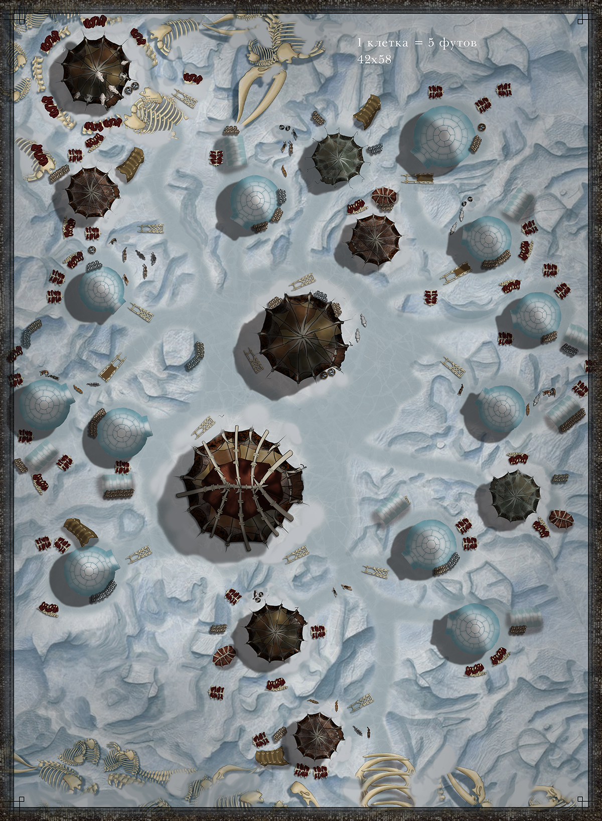 Деревня Ледяных Охотников представляет собой набор ледяных укрытий и тентов, расположенных в центре острова. Сушится и вялится рыба и китовое мясо, собаки, нарты из костей...