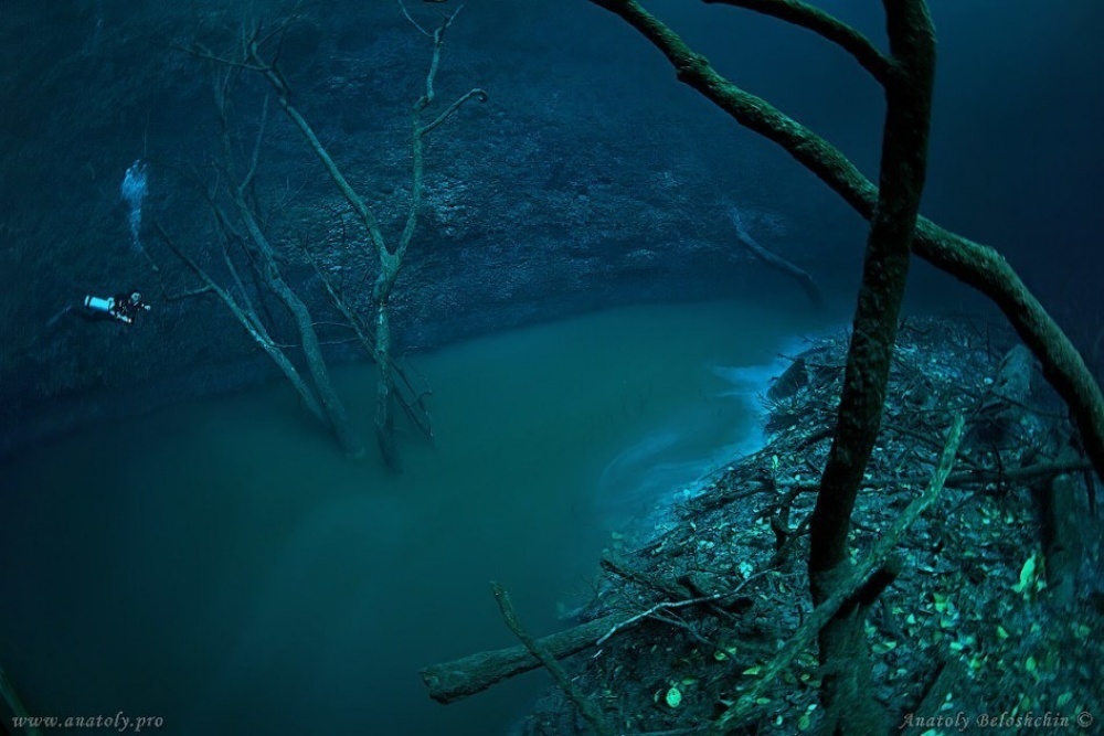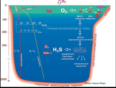 Ниже линии сероводорода жизни нет . Выглядит как подводные озёра . А ниже этой линии люди ещё не спускались .