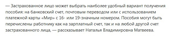Супруга трудится в коммерческой организации среднего масштаба. Сегодня им объявили, что больничные и прочие соцвыплаты с 1 июля будет оплачивать напрямую ФСС (сейчас этим занят работодатель) и перечислять их на карту МИР (можно ещё на банковский счет или почтовым переводом). Казалось бы умное начинание, направленное на упрощение подобных моментов, а также минимизацию рисков, при отсутствии у работодателя денег. Но есть один нюанс... Нахуя мне этот Мир?