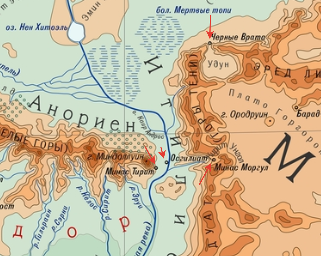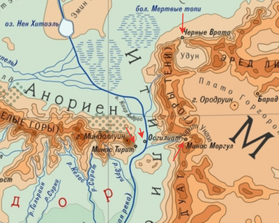 По фильму Мордор и Минас Тирит где то рядом, можно в окна заглядывать. Но помню в книге описано будто Ара с толпой шли ли туда чуть ли не неделю после последней битвы. А на карте тоже тут чисто дорогу переплыть. Тогда чего они так долго шли?