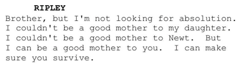 После вопроса о том, когда всех монахов сослали на этот планетоид, Рипли спрашивает, что же случилось с матерью Джона. Тот сообщает, что она ушла от его отца, когда тот вступил в движение, а потому был с ней разлучён достаточно рано, после чего Рипли признаётся, что когда-то и сама была матерью: она пообещала своей дочери Кэти (очевидно, режиссёрской версии Кэмерона сценарист ещё не видел) вернуться скоро после полёта на Nostromo, но ничего не вышло. Как и не вышло с Ньют, а потому, чтобы не корить себя и иметь хоть какой-то стимул бороться, она выдаёт следующее: