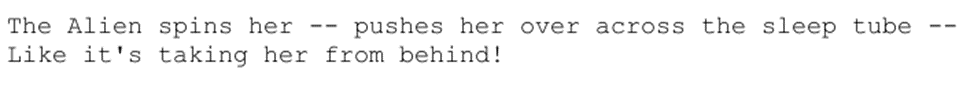 При чём описывается сама сцена довольно-таки болезненно, но своим накалом напоминает скорее не боди-хоррор, а какой-нибудь грайндхаус. Как бы то ни было, а внезапный чужой, не смущающийся всего природного, утаскивает бедолагу и устраивает фонтаны из человеческой крови, бьющих прямо из резервуаров.