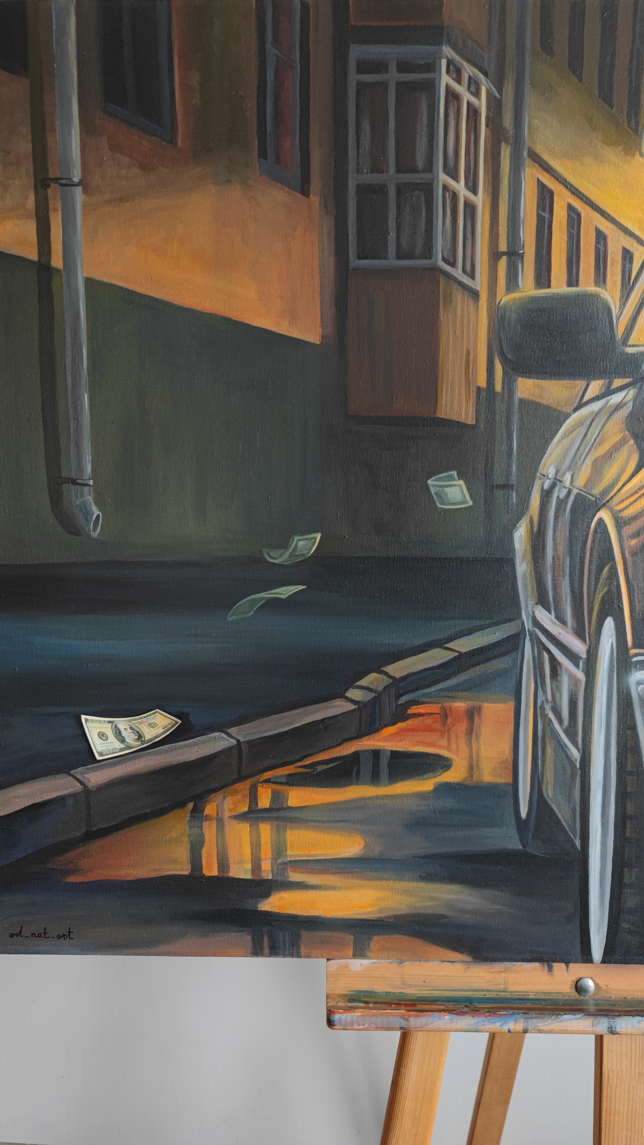Это не просто картина, это арт-объект , с которым можно контактировать. Картина оснащена аудиосистемой, и при открывании 100-долларовой купюры, начинает играть Песня Серёги "Черный бумер", как дополнение к общему состоянию, она полностью погружает зрителя в эпоху начала 2000-х годов.