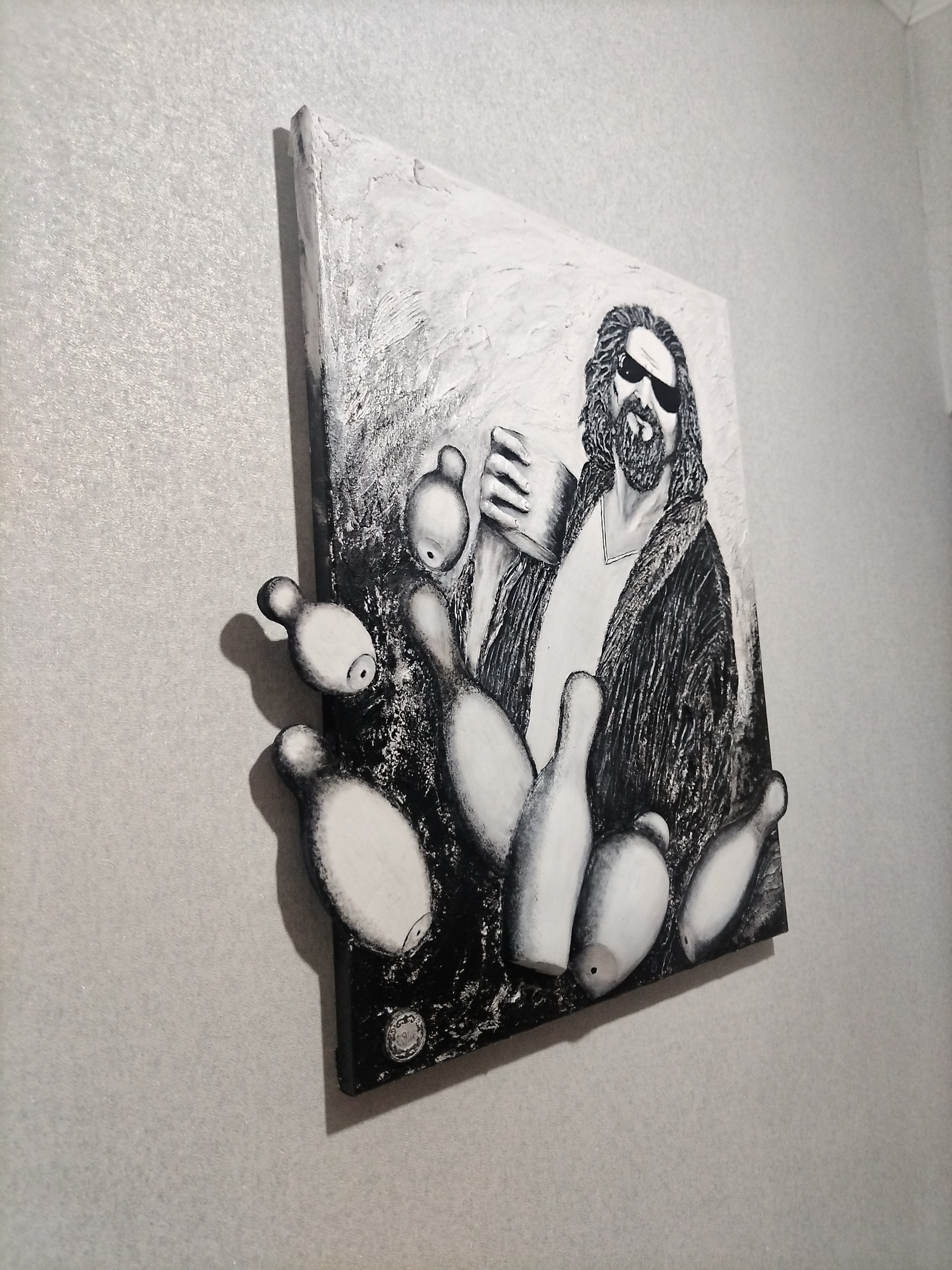 Для близкого друга дочка попросила нарисовать картину. Персонаж картины - Лебовски. Учитывая, что это ну совсем не "герой моего романа" и до этого момента я им не интересовалась, фильмов не смотрела, пришлось срочно знакомиться, лопатить интернет. Надо же как-то композицию строить))