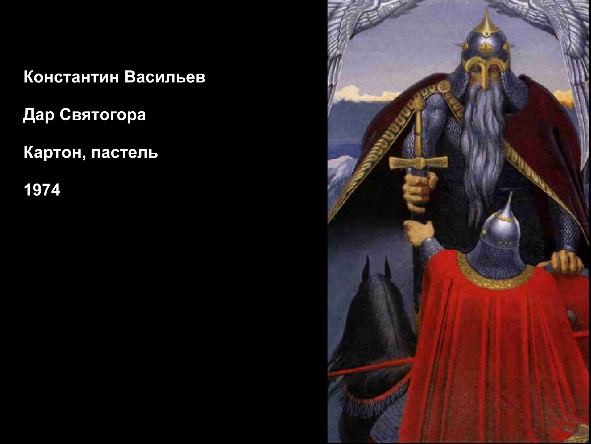 На картине художника мы видим как загадочный великан передает свой заветный меч первому из богатырей русских – Илье-Муромцу со словами: «А теперь прощай мой меньший брат, возьми мой меч-кладенец, владей силой моей богатырской…». Существуют многочисленные варианты былины об этом событии, но главное, что К. Васильеву удалось выразить идею, что истинному богатырю русскому необходимо единство силы телесной и духовной.