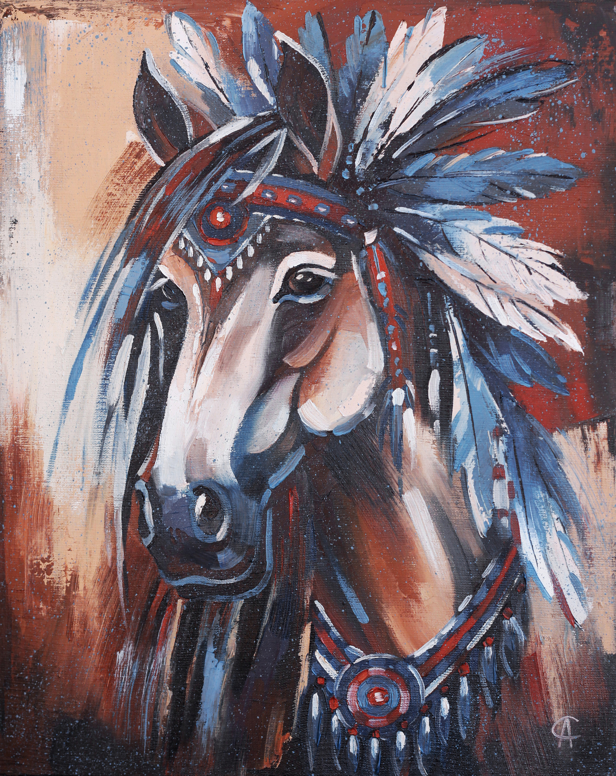 В этническом стиле, лошадь-женщина по имени Тахок (что означает "мудрость земли"), словно жена вождя, несет в себе величие и мудрость предков, её перья и украшения говорят о духовной связи с землей. Она призывает к гармонии с природой и внутреннему пробуждению, заряжая зрителя энергией силы и свободы. Символизируя бесконечный путь и глубокую связь с традициями, она становится проводником в мир древних знаний.