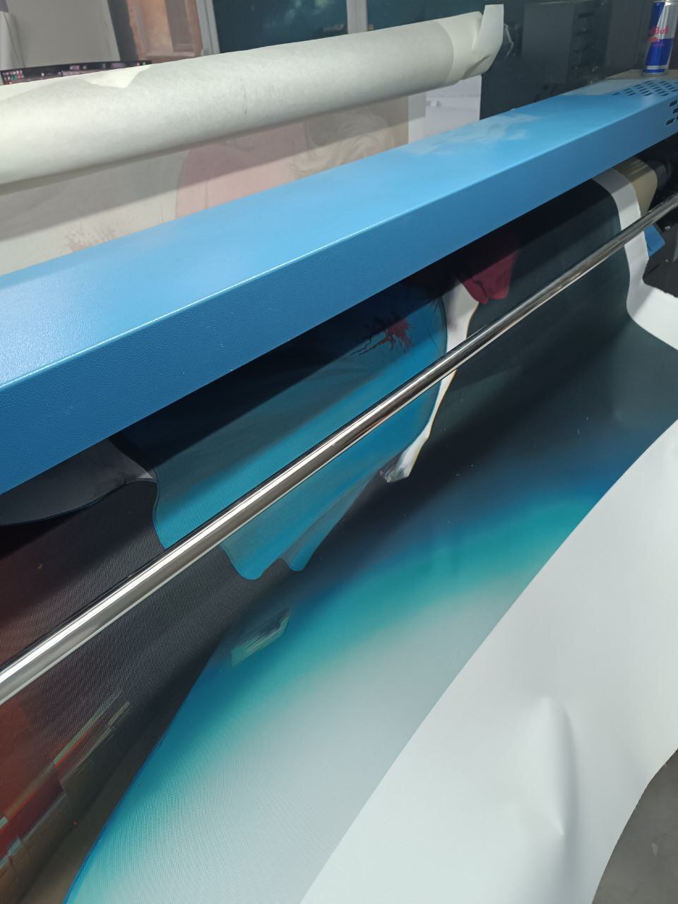 С обратной стороны выходит ткань с уже нанесённым изображением. Закреплять на намотчике не стали, длина не большая.