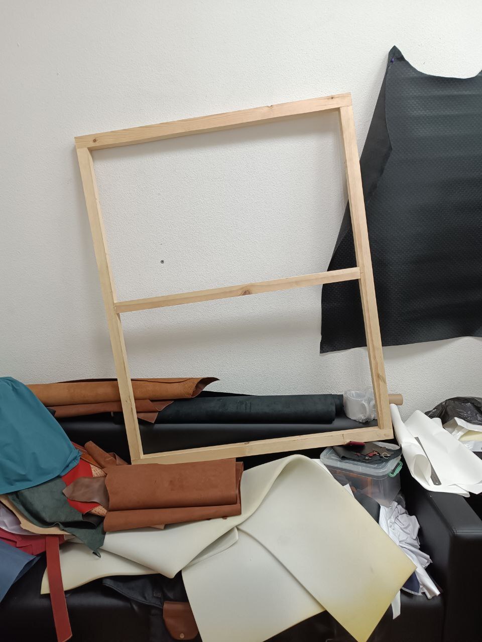 Размер известен, поэтому договорился с рекламщиками (стенды делают) на изготовление "рамки". Брусок нашелся только 50*50))). Куча всякого на диване - последствия перестановки в мастерской.