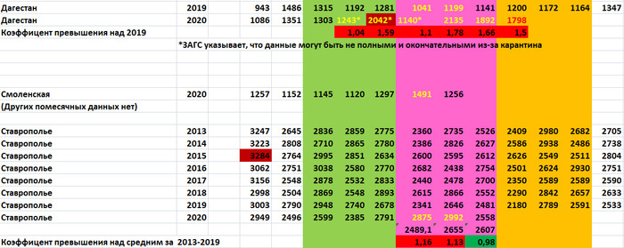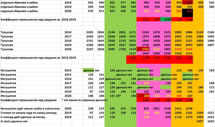 По мере развития эпидемии пополняю экселевскую табличку на основе открытых данных ЗАГС по смертности в нескольких регионах. К сожалению, открытых данных по другим регионам не нашёл, но так как среди открытых есть регион, где я живу, соседние регионы и более-менее разносторонняя выборка по всей стране, мне этого достаточно. Мне кажется, что данные ЗАГС о смертности от всех причин, хотя и должны иметь более слабую корреляцию с ходом эпидемии в сравнении с официальными данными о погибших именно от коронавируса, но зато могут иметь более высокую достоверность. Сайт не предполагает обмен файлами иных форматов, чем картинки и видео, так что саму таблицу предоставить не могу. Если кому нужно - действуйте методом реверсинженеринга. В черных квадратах - максимальные месячные "цифры"* по региону за период, по которому доступны наблюдения. В таких же бордовых квадратах - "цифры", бывшие максимальными месяц назад или максимальные, если октябрьские не превысили их. Коэффициенты превышения получены делением "цифры" данного месяца 2020 года на среднее арифметическое за предшествующий период наблюдений в данном регионе в данный месяц.