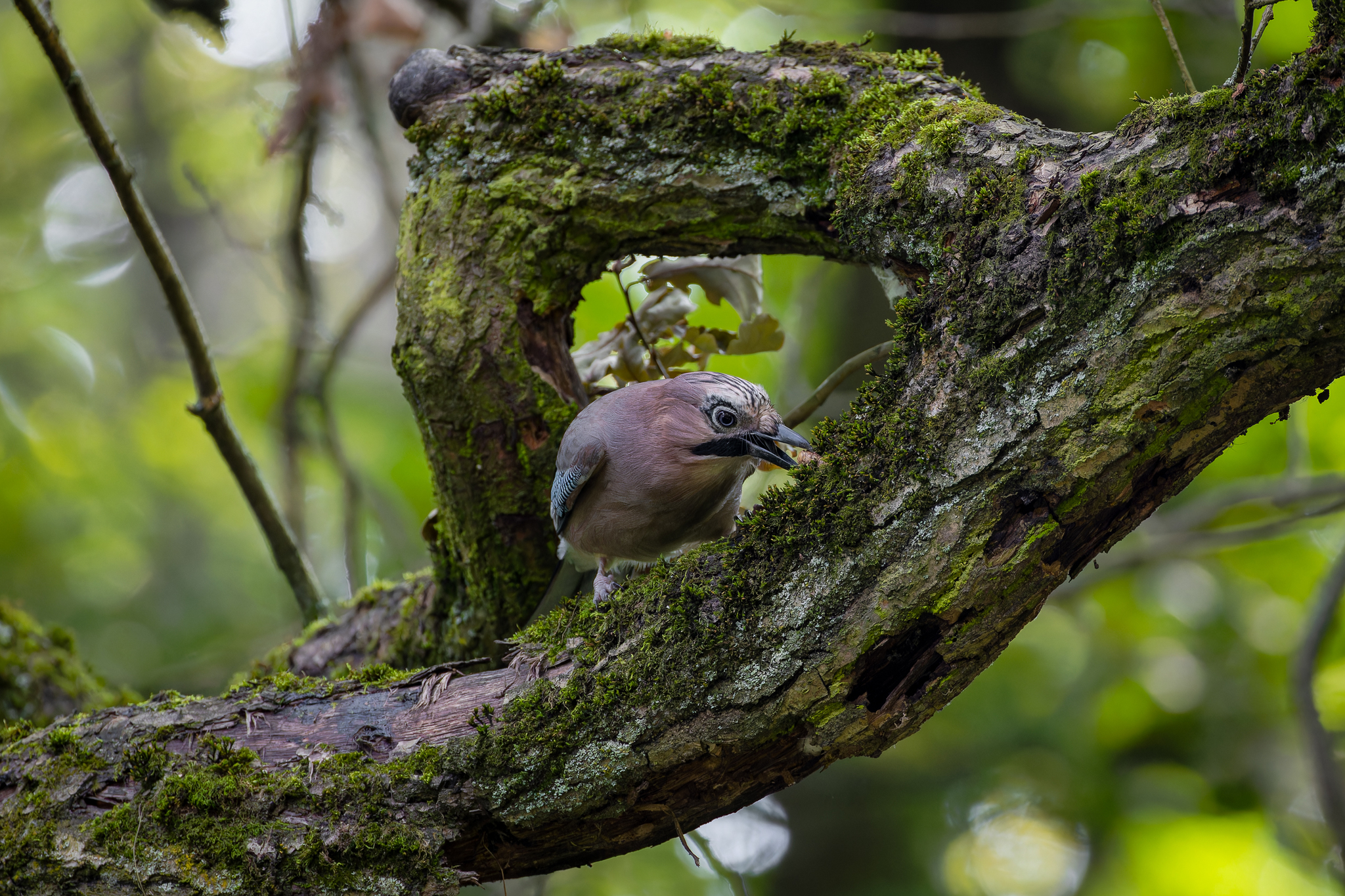 Сойка, выколупывает орехи спрятанные дятлами и поползнями