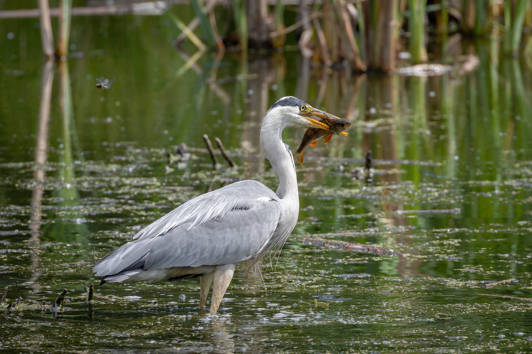 Серая цапля. Активно ловила рыбов, показывала