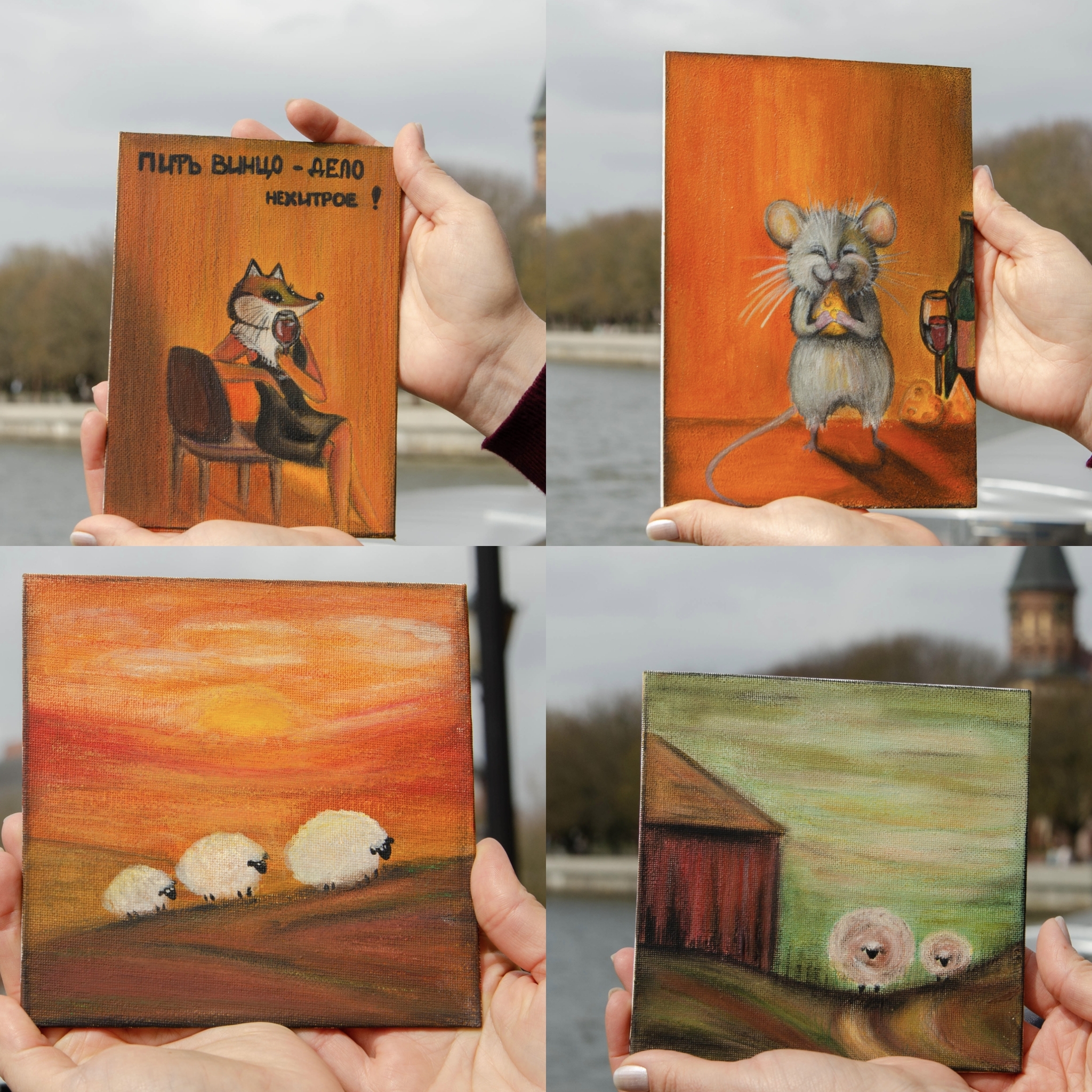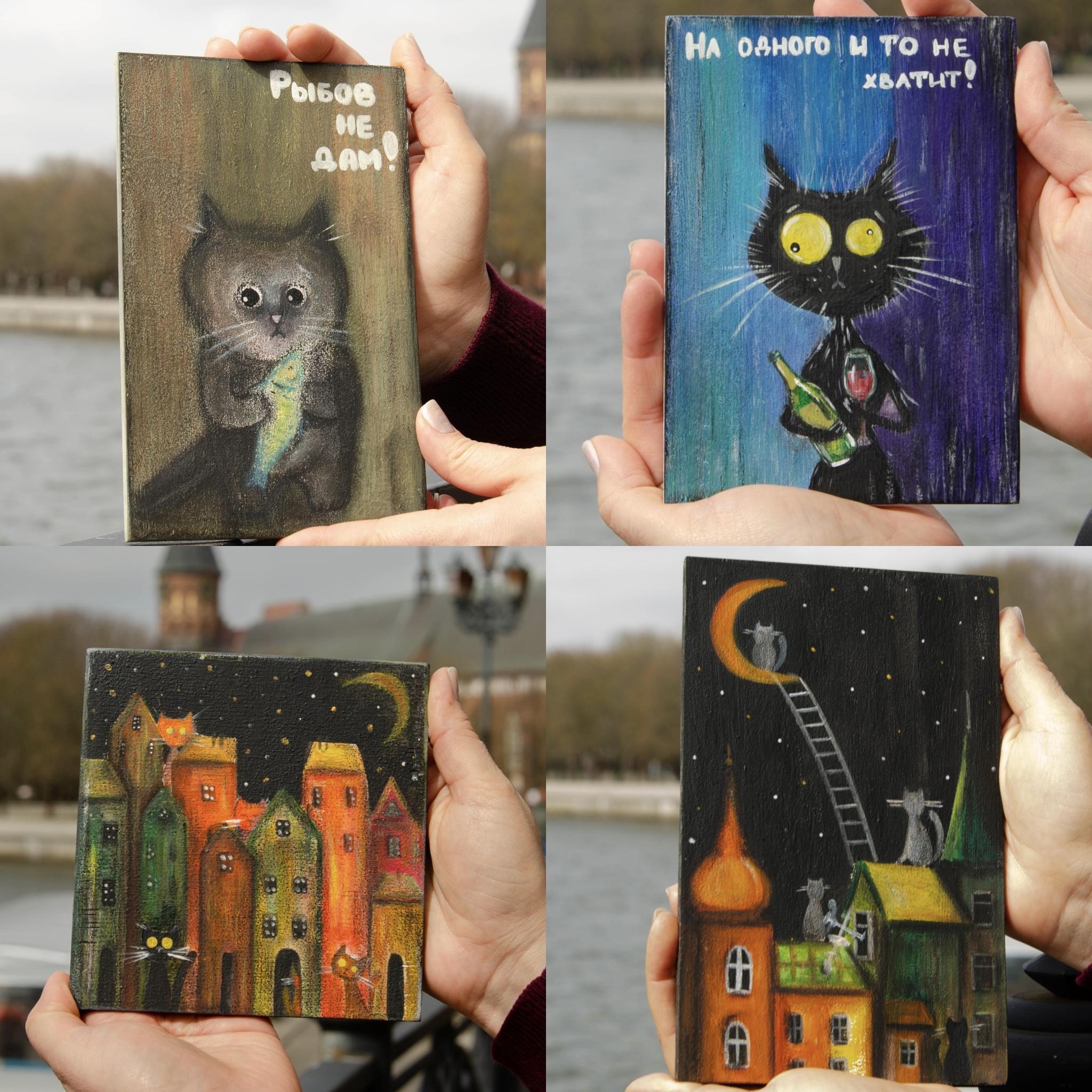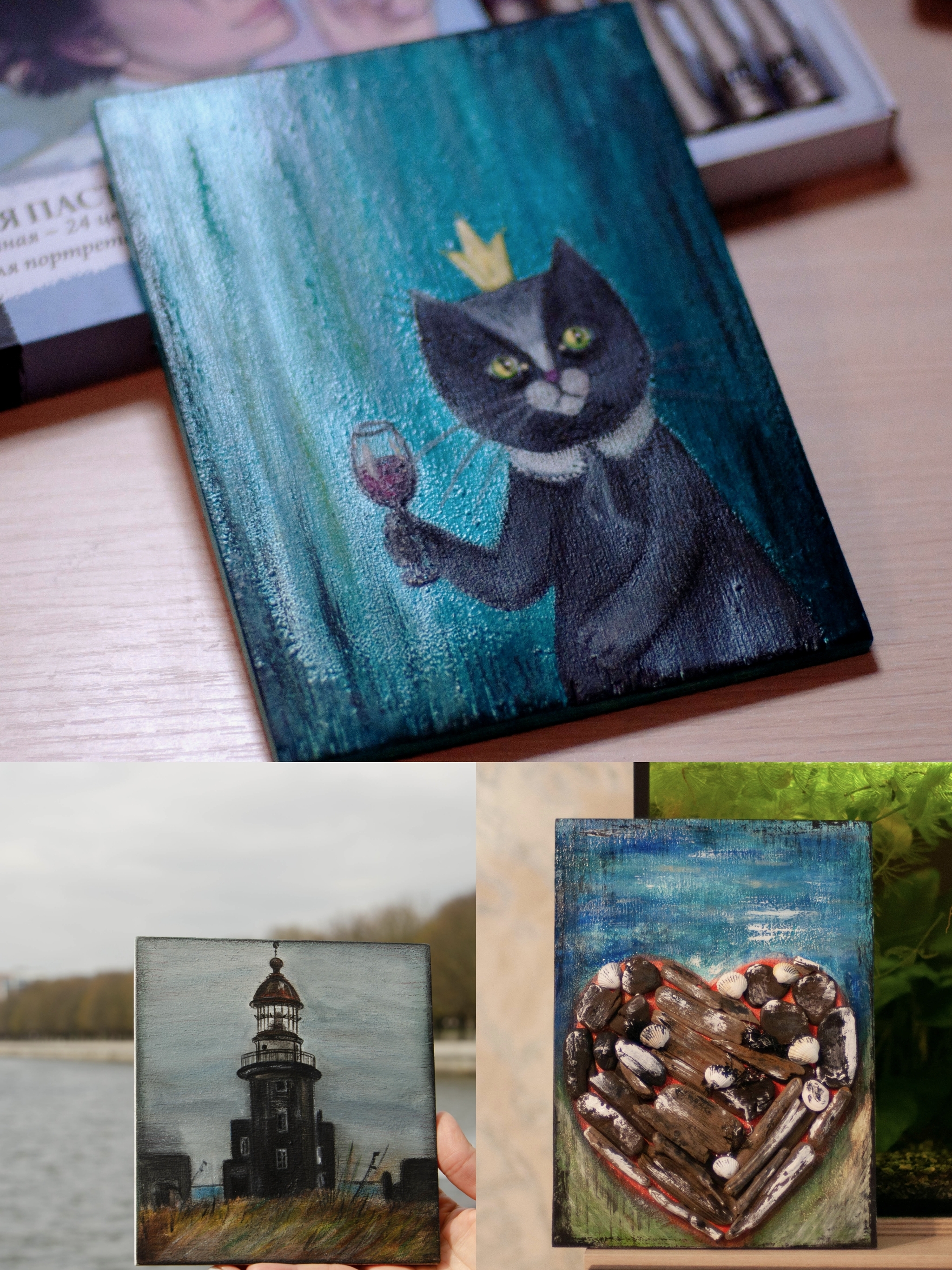 Форматы картин разные. Есть на холсте, на дереве или артборде. Чаще пишу миниатюры, но есть и чуть большего формата. Не циклюсь на чем-то одном, люблю развиваться в разных направлениях. Так же и с материалами.