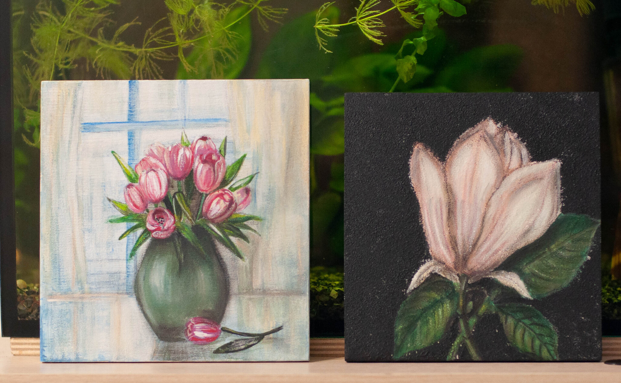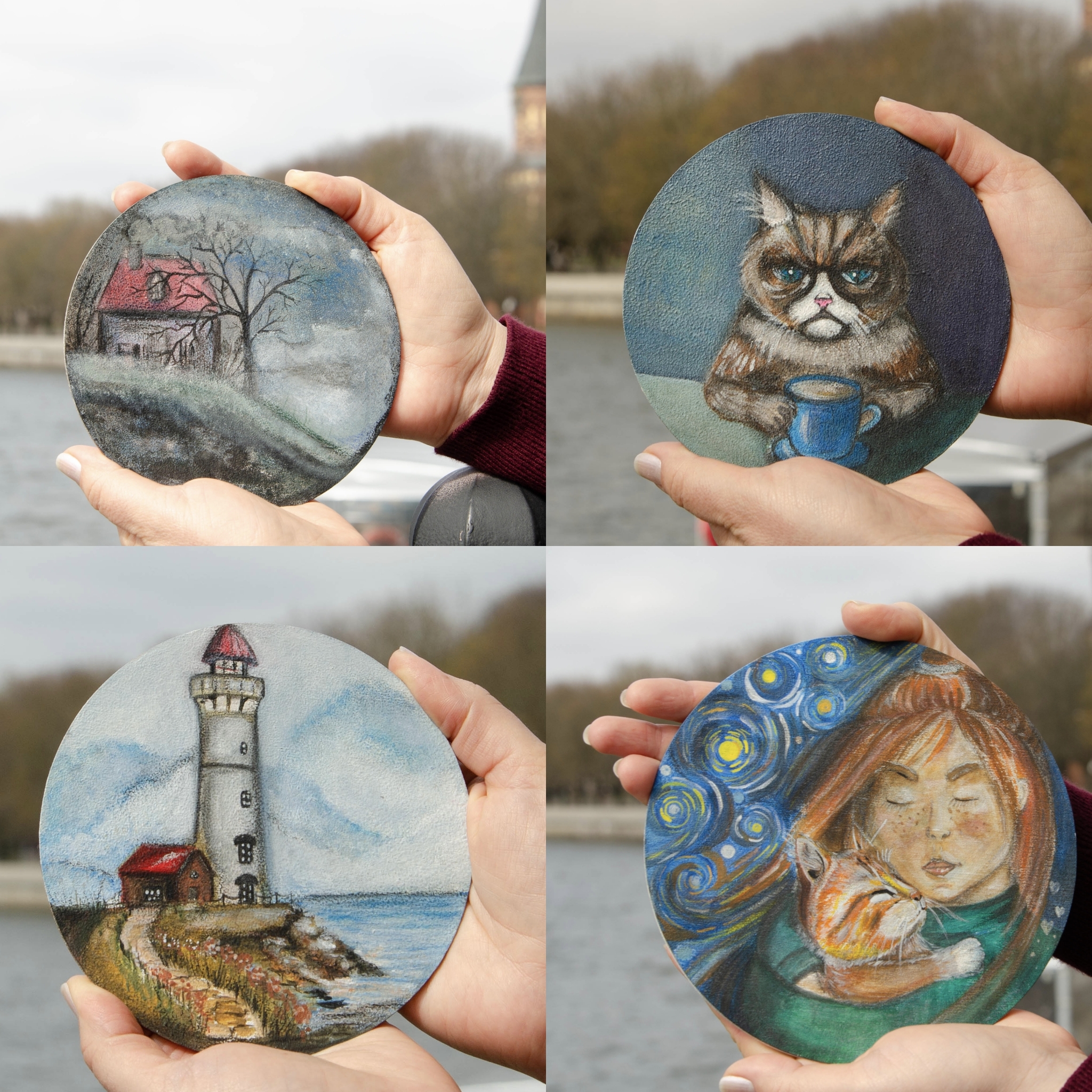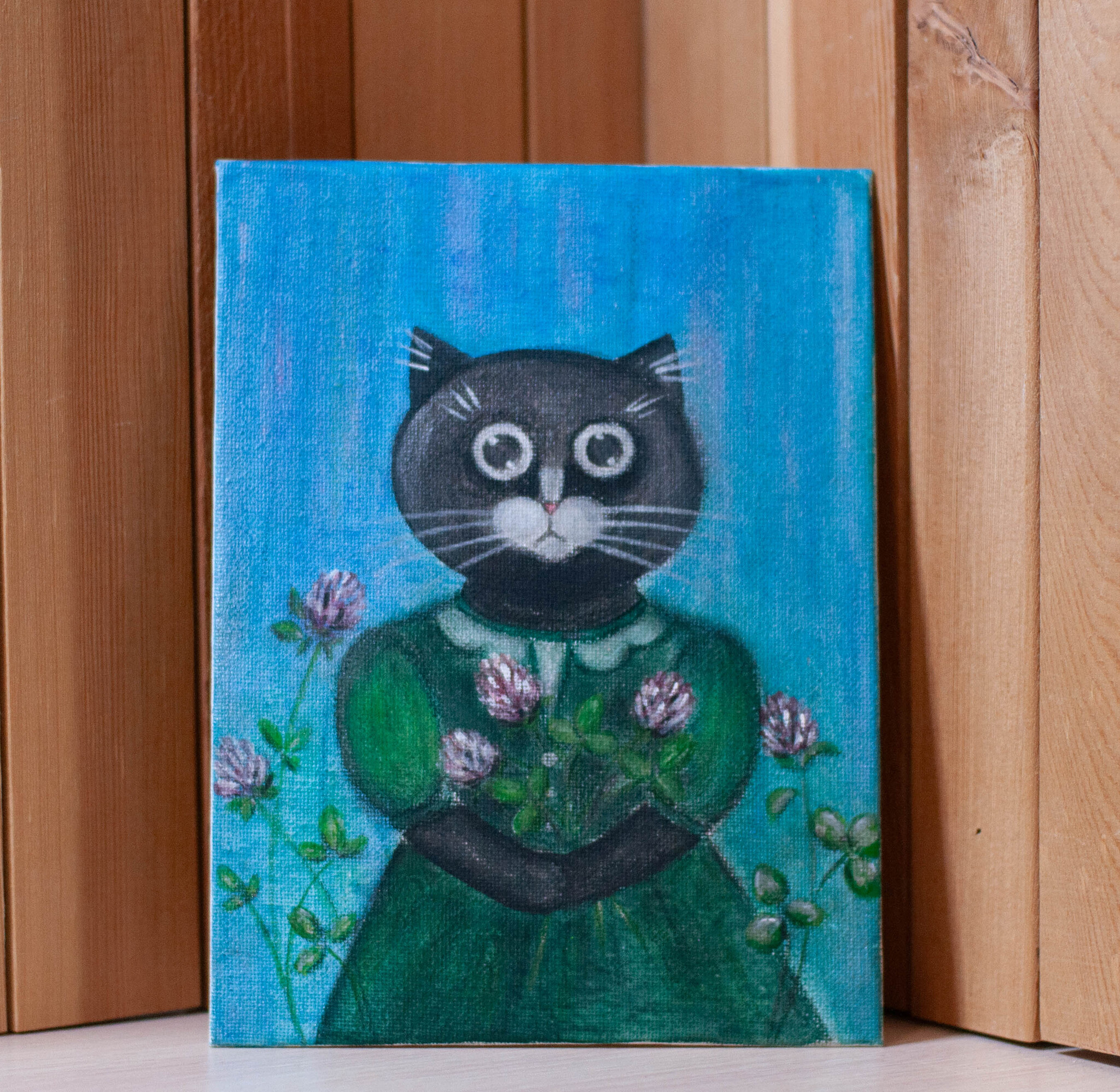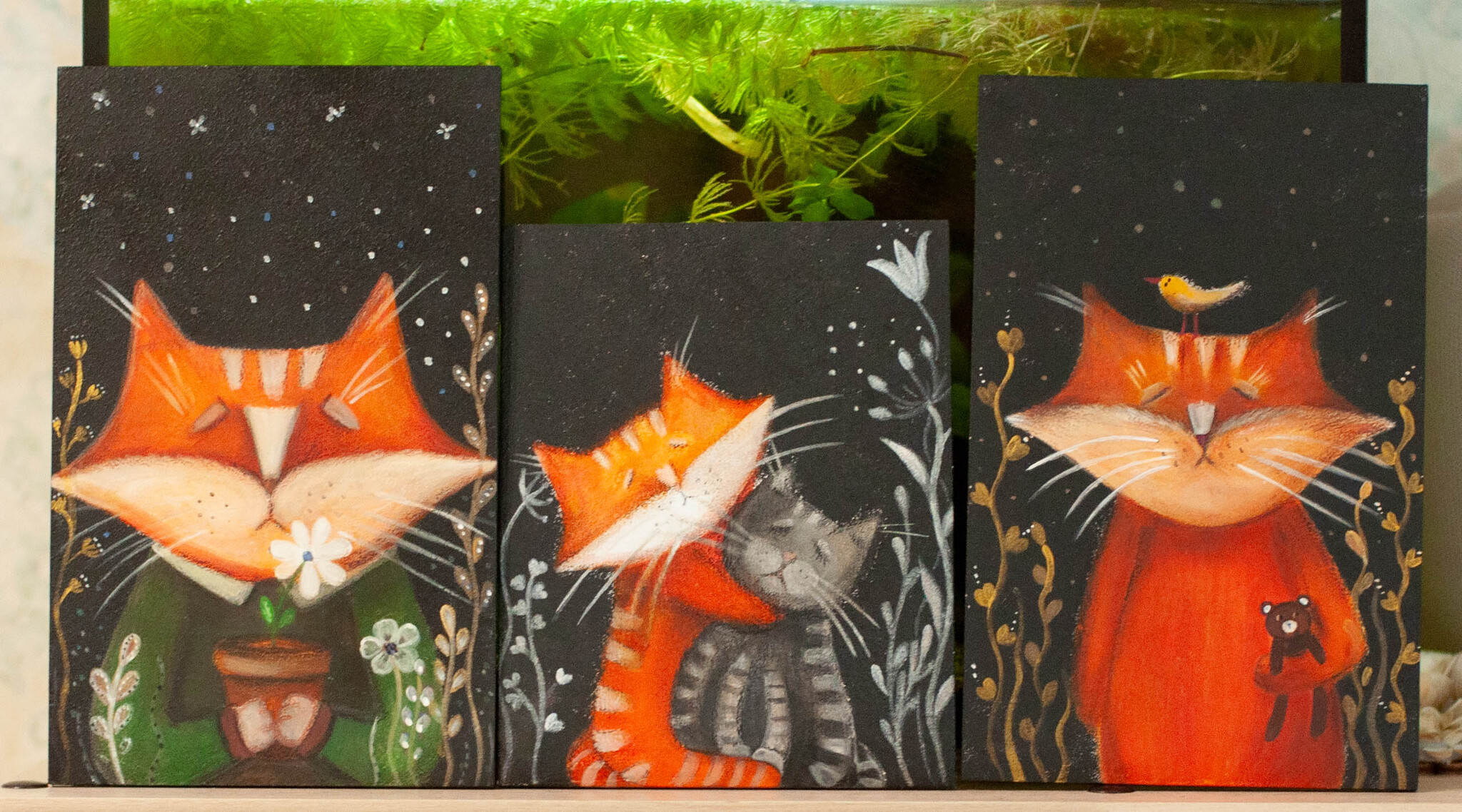 Форматы картин разные. Есть на холсте, на дереве или артборде. Чаще пишу миниатюры, но есть и чуть большего формата. Не циклюсь на чем-то одном, люблю развиваться в разных направлениях. Так же и с материалами.