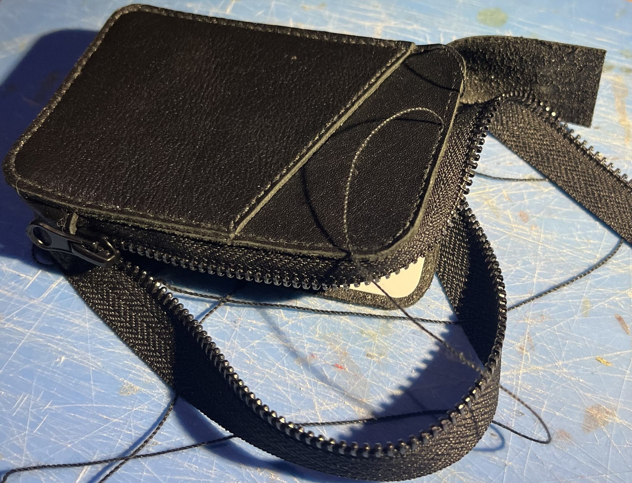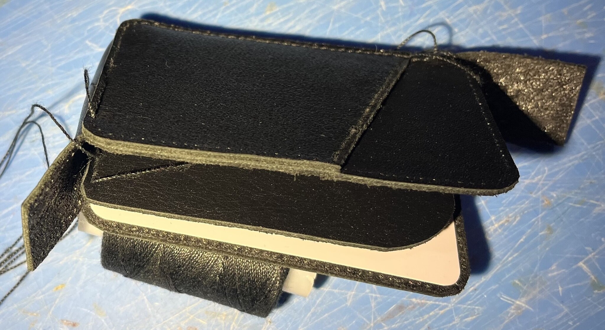 Как и положено, процесс. Сшивать седельным швом такую штуку, габаритами меньше пачки сигарет, то еще удовольствие.