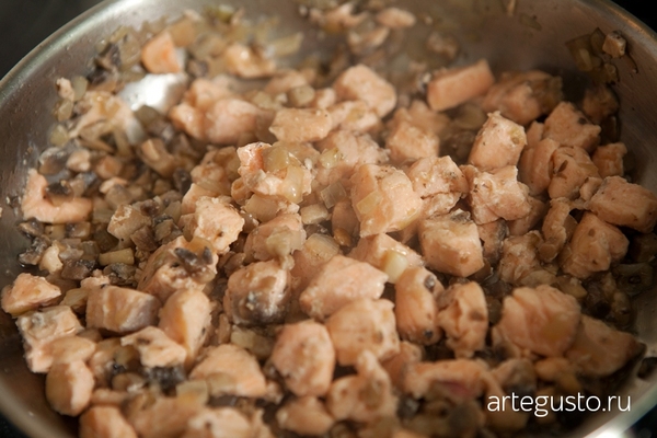 Пока картофель доводится до полуготовности, займемся начинкой. Нарезанные сёмгу, лук и грибы жарим на сковороде до полной готовности. Периодически перемешиваем ингредиенты деревянной лопаткой, чтобы они равномерно прожарились. Солим и перчим по вкусу.