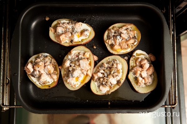 Картофель разрезаем пополам на две части и удаляем сердцевину. Лук-шалот, семгу и шампиньоны нарезаем кубиками 1х1 см. Солим и перчим по вкусу. В каждую картофелину заливаем немного оливкового масла. Выкладываем на противень и помещаем в жарочный шкаф, разогретый до температуры 220 градусов, на 25 минут.