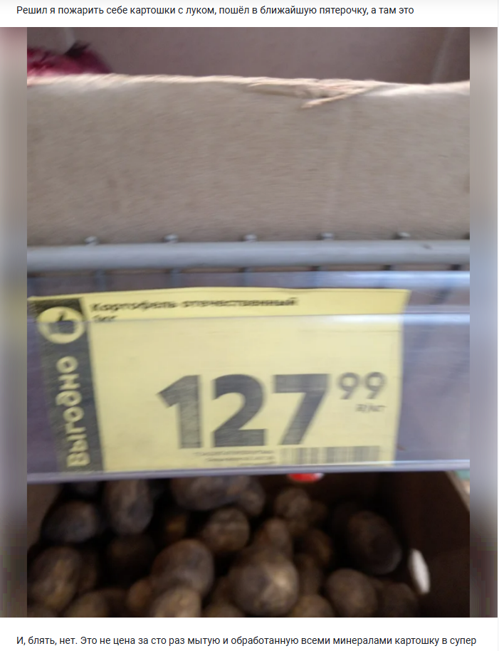 Сразу начну с того, что в порыве страсти желания написать коммент, я немного сам себя подставил. И придется все расставить на места. Если мы проследуем от оригинального поста, то мы имеем: Картофель продовольственный, сетевого(хорошего) качества в Подмосковье в сетевом магазине по 128р. В дальнейшем в ответе на пост автор заявляет о таком же картофеле по 26р. В моей голове остальные параметры остались прежними(Подмосковье, картофель продовольственный, "сетевого" качества), но в своем комменте я это не зафиксировал, что дало людям простор для вариантов. Но давайте все-таки будем честны, параметры следуют за оригинальным постом и ответом на пост.