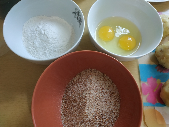 Берем муку, яйца (в последствии смешиваем их, до более менее однородного состояния) и панировочные сухари.