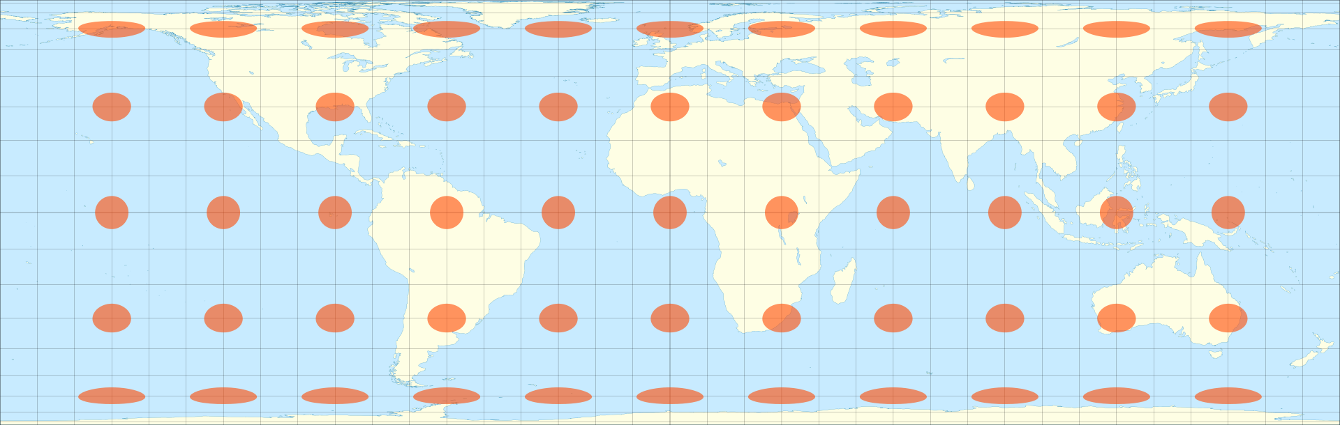 Она же - равноугольная цилиндрическая проекция, то есть с помощью нее мы для каждой точки на сфере получим точку на поверхности цилинидра. Бóльшие искажения получаются при приближении к полюсам, при этом если зафиксировать широту, но менять долготу, то есть идти вдоль экватора - искажений не будет.