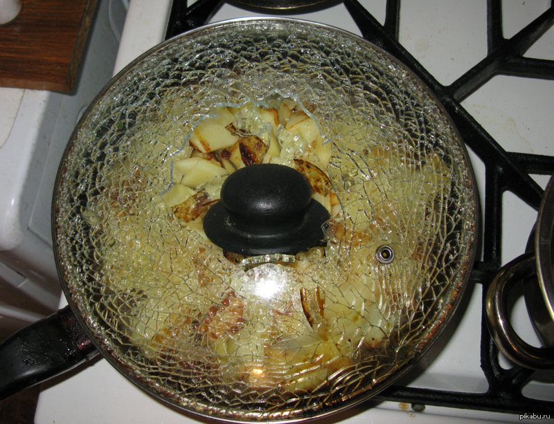 1023 Murcie 11 лет назад картошечка .. со стеклом Картошка почти готова, прикрываю крышкой, ухожу в комнату. Через несколько минут слышу треск стекла. Было настолько красиво, что рука сама дотронулась до крышки [моё] Неудача Fail Посуда