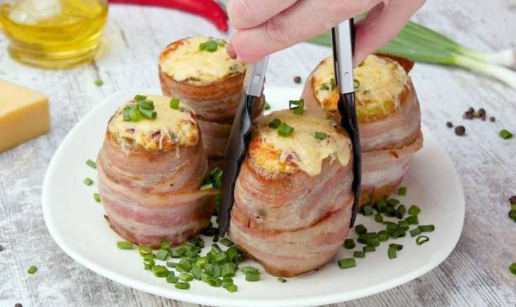 Обмотать картофель беконом, посыпать сыром и запекать при 200 градусах до золотистой корочки. Посыпать зеленью.