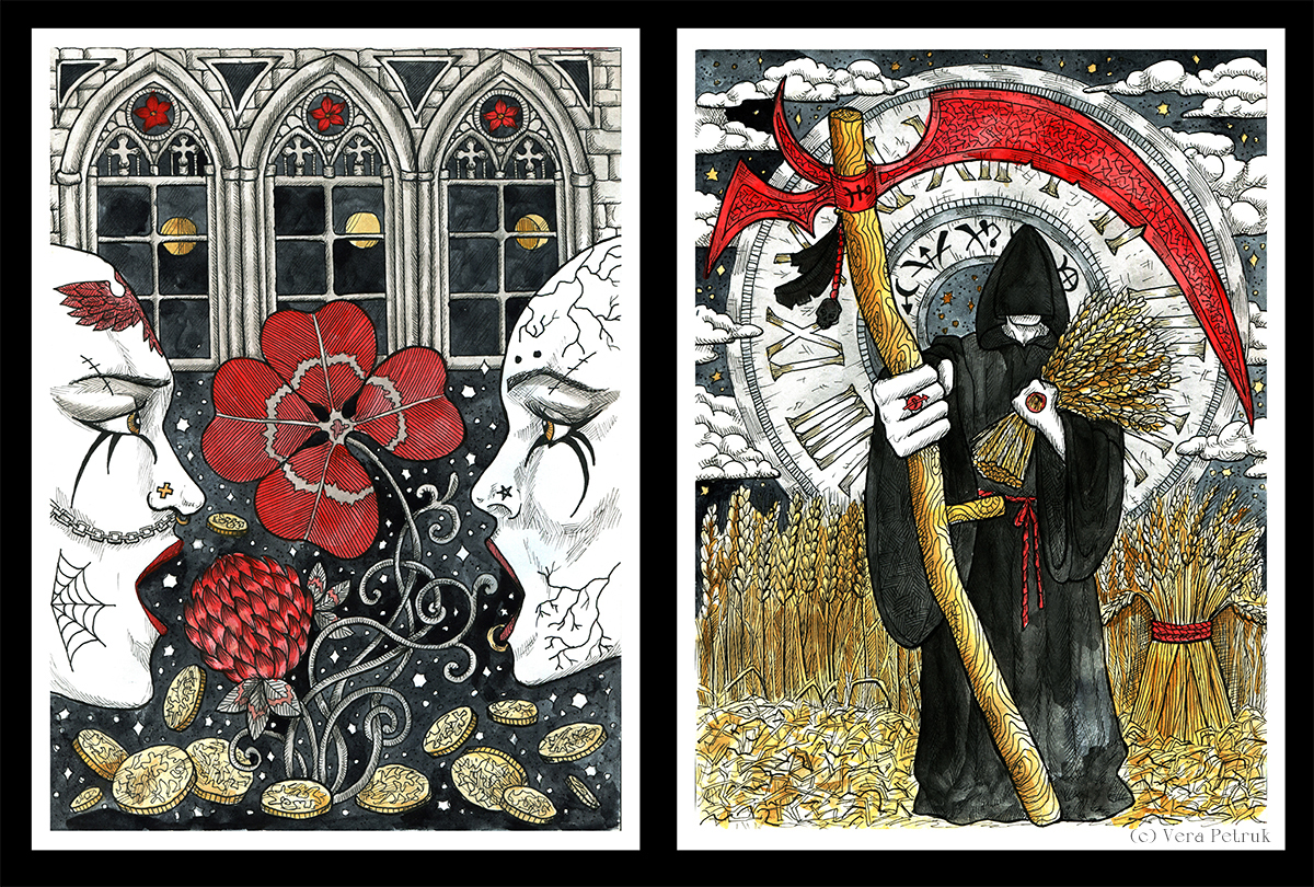 2 VeraPetruk Карты для оракула Ленорман 23 часа назад Иллюстрации для карт "Клевер" и "Коса" оракула Ленорман. Рисовала эту колоду года четыре назад, называется "Готические мистерии Ленорман", тираж выпускало издательство Magic-Kniga.Акварель, линеры, бумага. [моё] Гадание Мистика Графика Эзотерика Оракул 1 Ещё 0