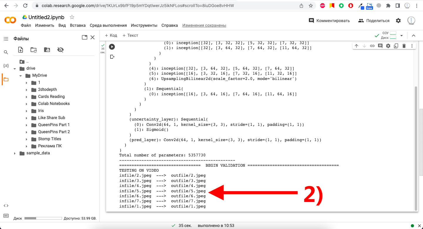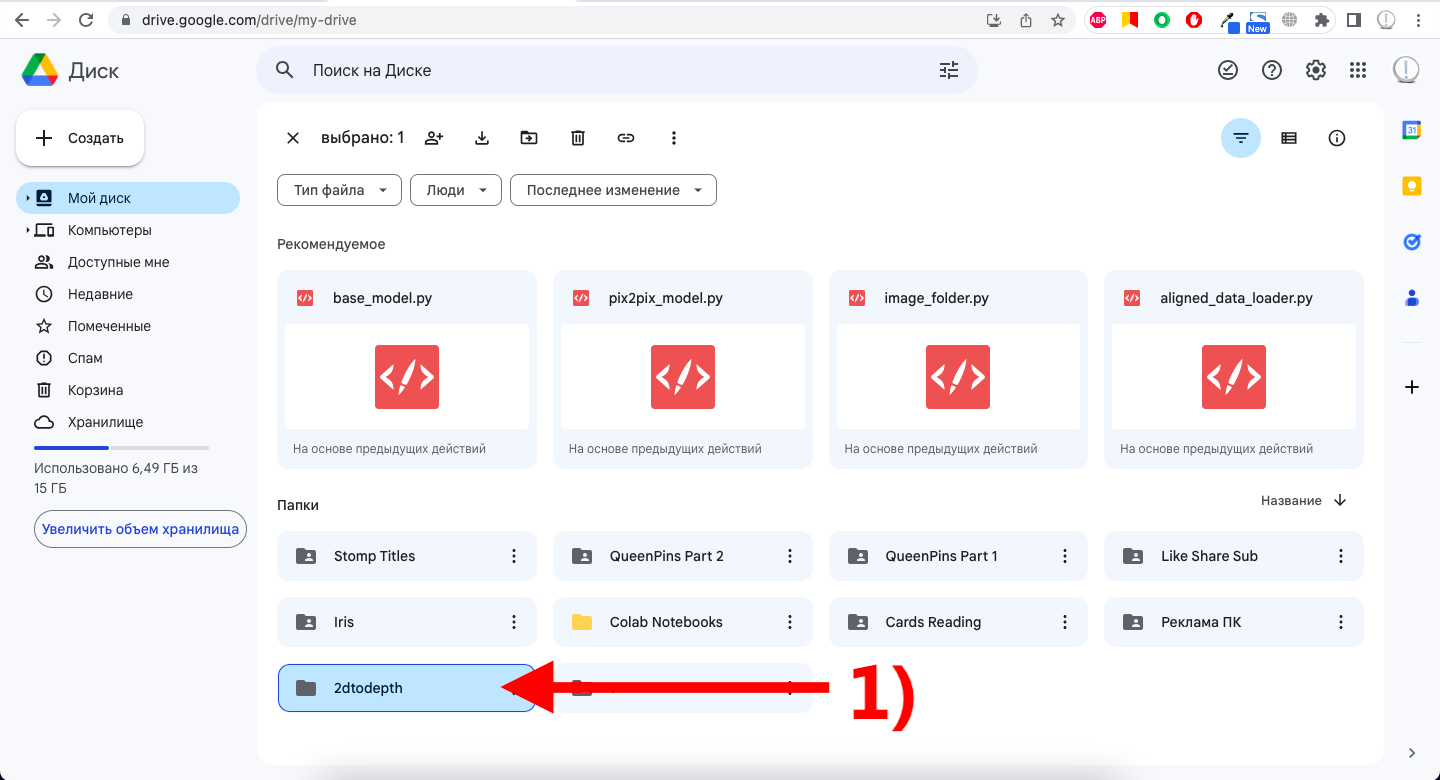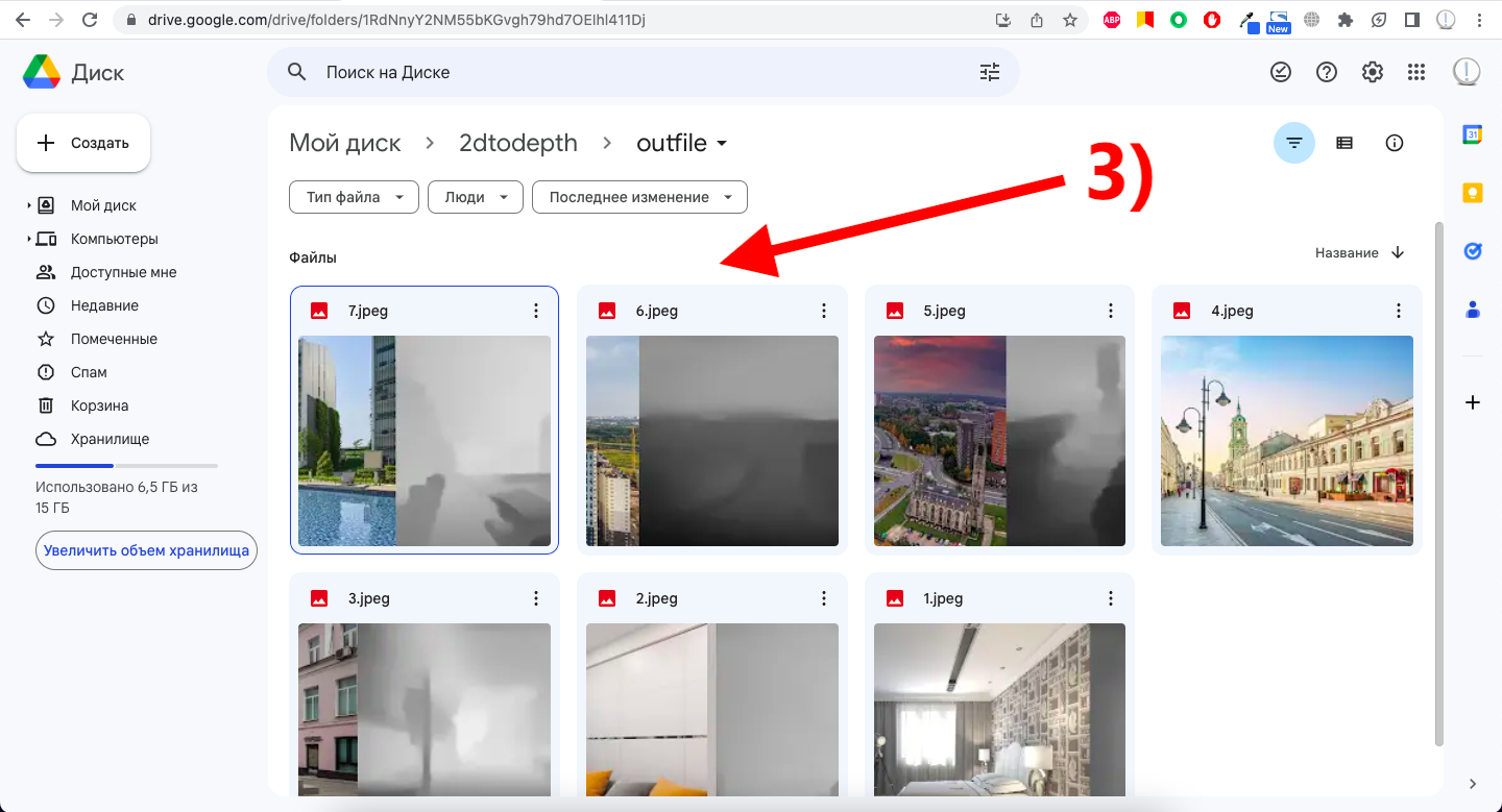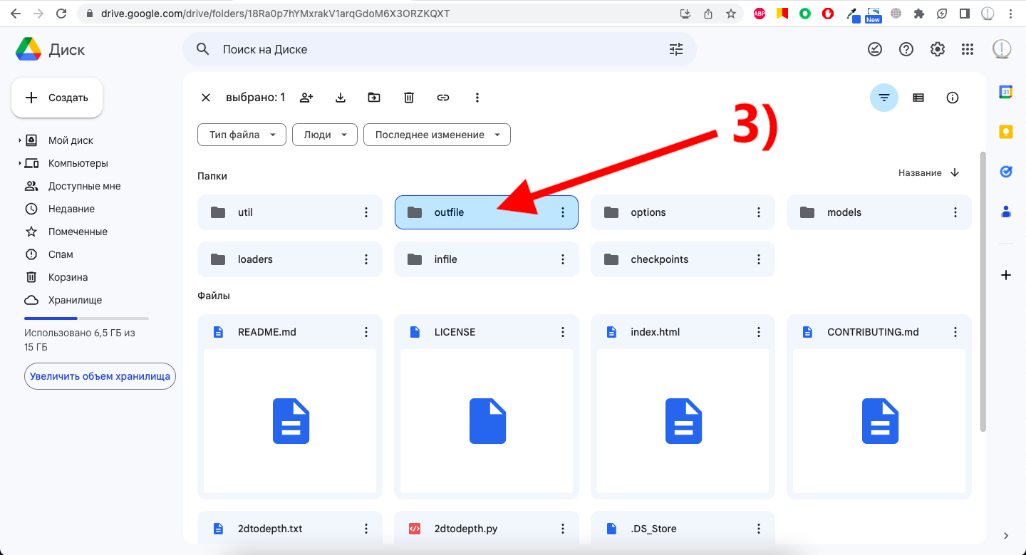 3) Возвращаемся в свой Google Drive, открываем папку 2dtodepth, находим папку outfile и видим там сгенерированные карты глубины