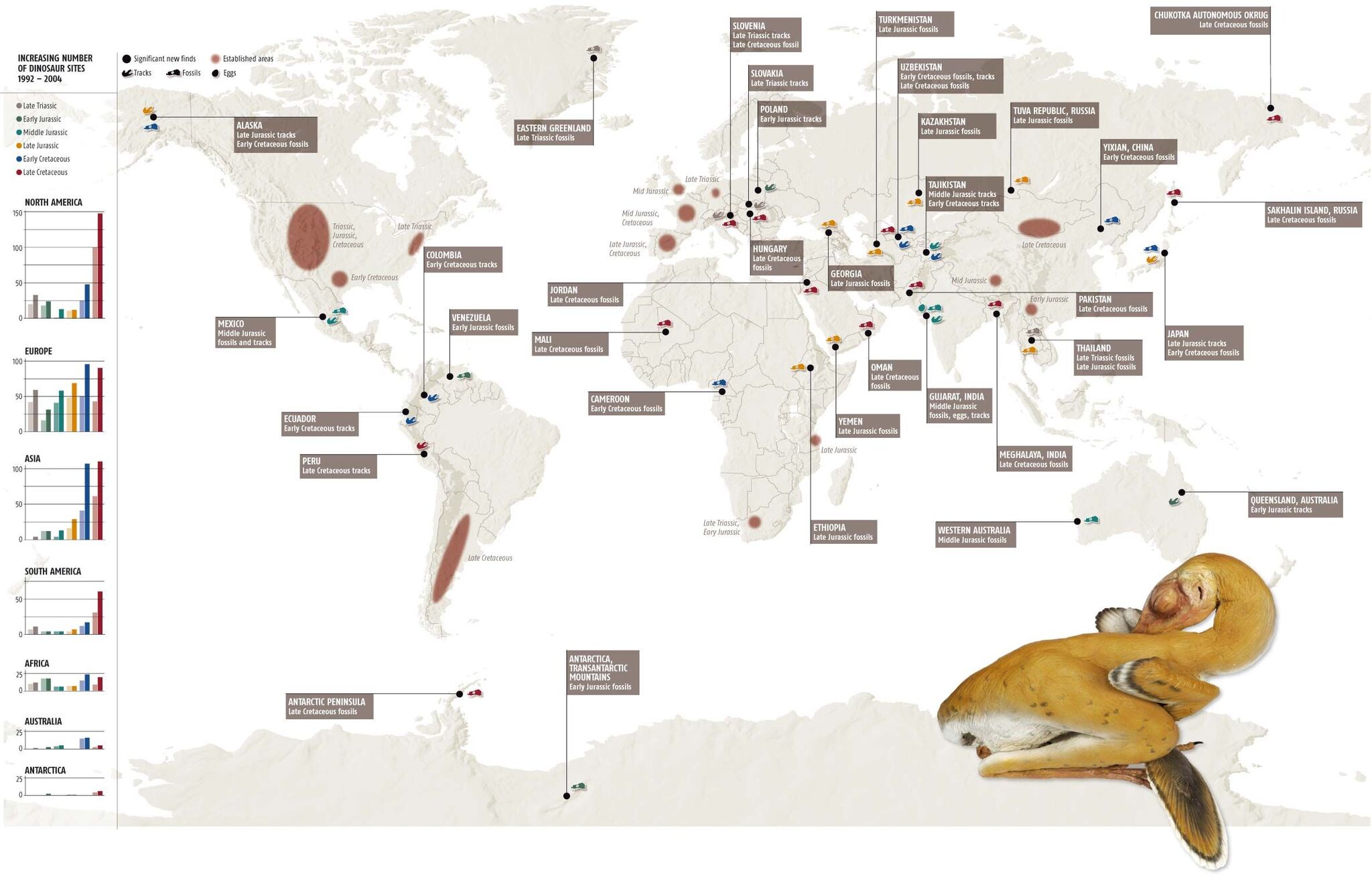 Карта местонахождений останков динозавров с 1992.г. по 2004.г.