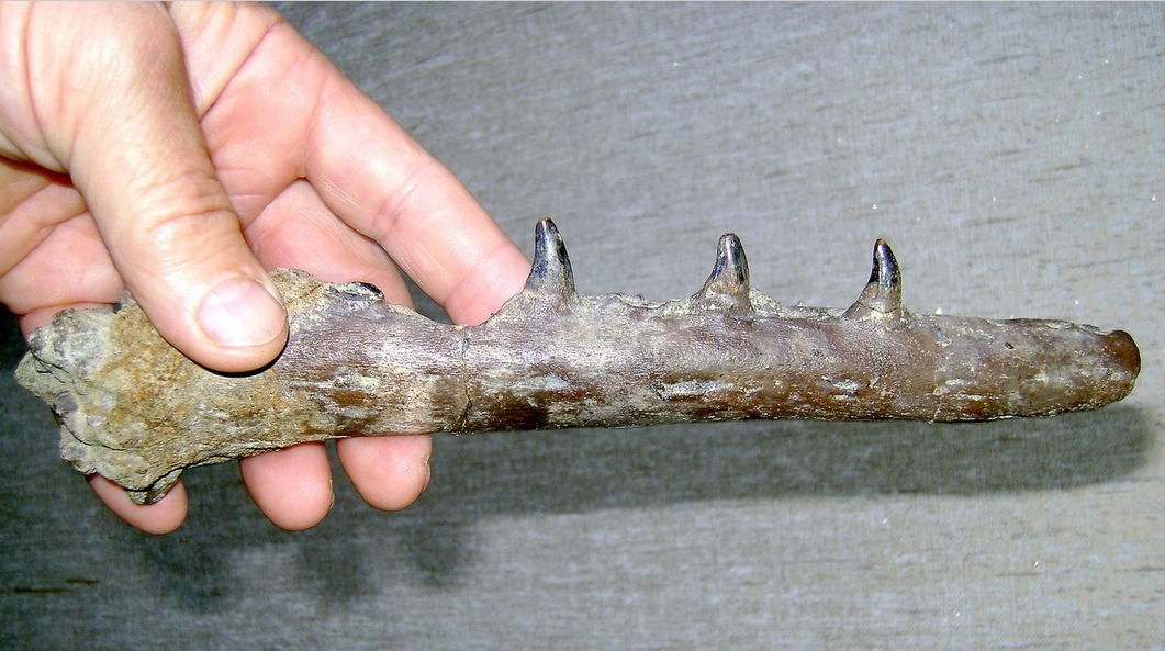 на фото Фрагмент птеригоида с нёбными зубами крупного мозазавра с юга Саратовской области. Фото © М. С. Архангельский
