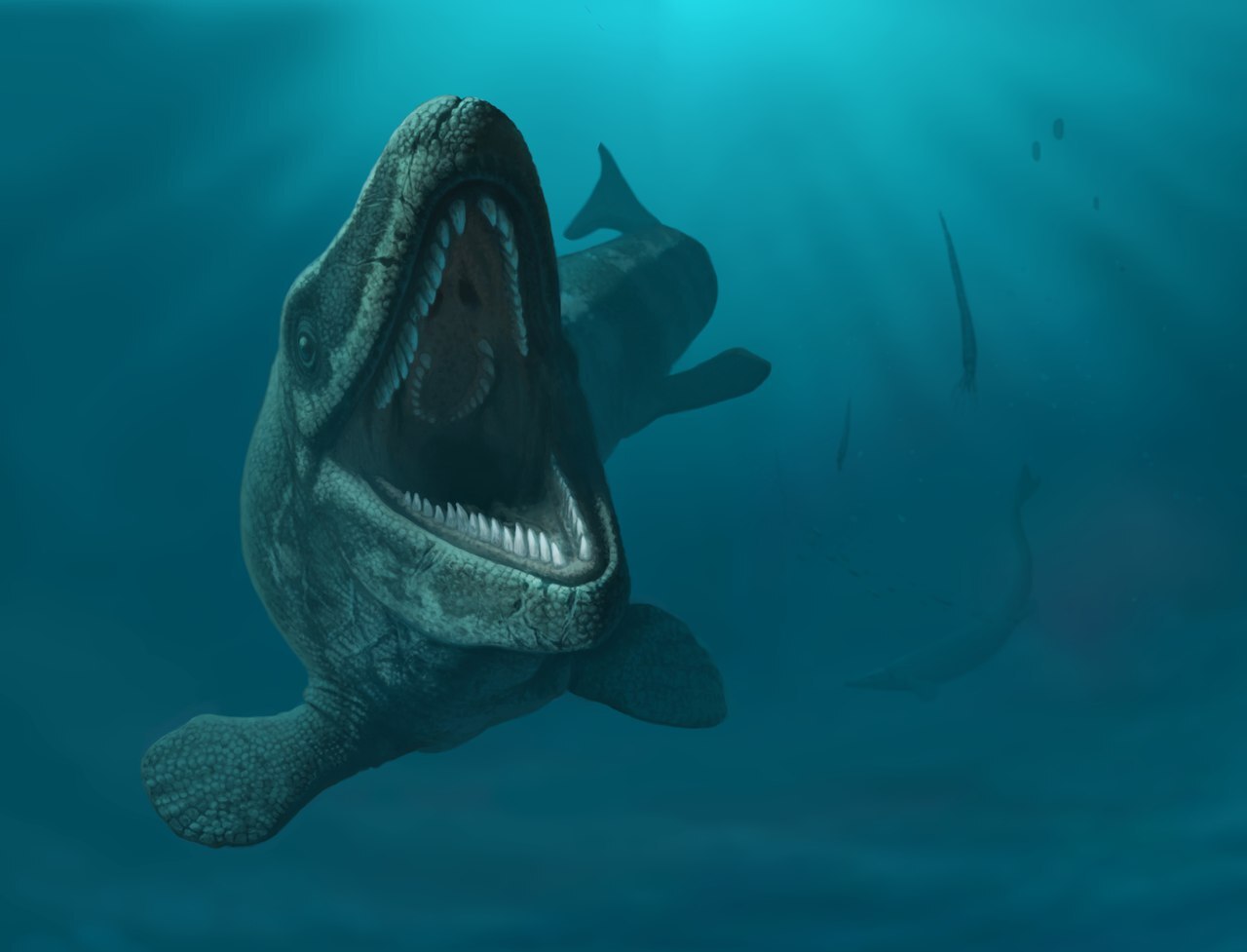На этой реконструкции изображен крупный мозазавр Гофмана из Поволжья. Они во множестве плавали в конце мелового периода в обширном Русском море — заливе древнего теплого океана Тетис. Остатки этих гигантов, достигавших более 17 м в длину, часто встречаются в серовато-зеленоватых песках, которые выходят на поверхность во многих местах Саратовской, Волгоградской и Пензенской областей. 80–70 миллионов лет назад этот песок выстилал дно Русского моря, в котором плавали громадные плезиозавры, черепахи и крупные рыбы: селедки-энходусы размером с тунцов, акулы и гигантские осетры, которые вырастали до десяти метров.