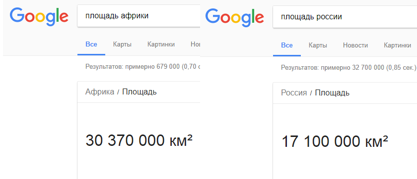 А вот если задать вопрос Гуглу напрямую - все оказывается наоборот! Африка почти в 2 раза больше!