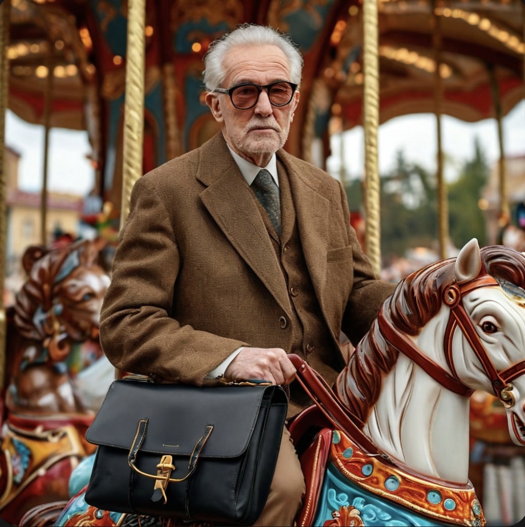 Чувствуя нарастающее недовольство и ожидание кондуктора, стареющий служащий покорно вскарабкался на деревянного скакуна. Автобус дернулся и тронулся с места. В ту же секунду коровы, лошади, собаки и кошки этой карусели стали приподниматься и опускаться на металлических шестах.