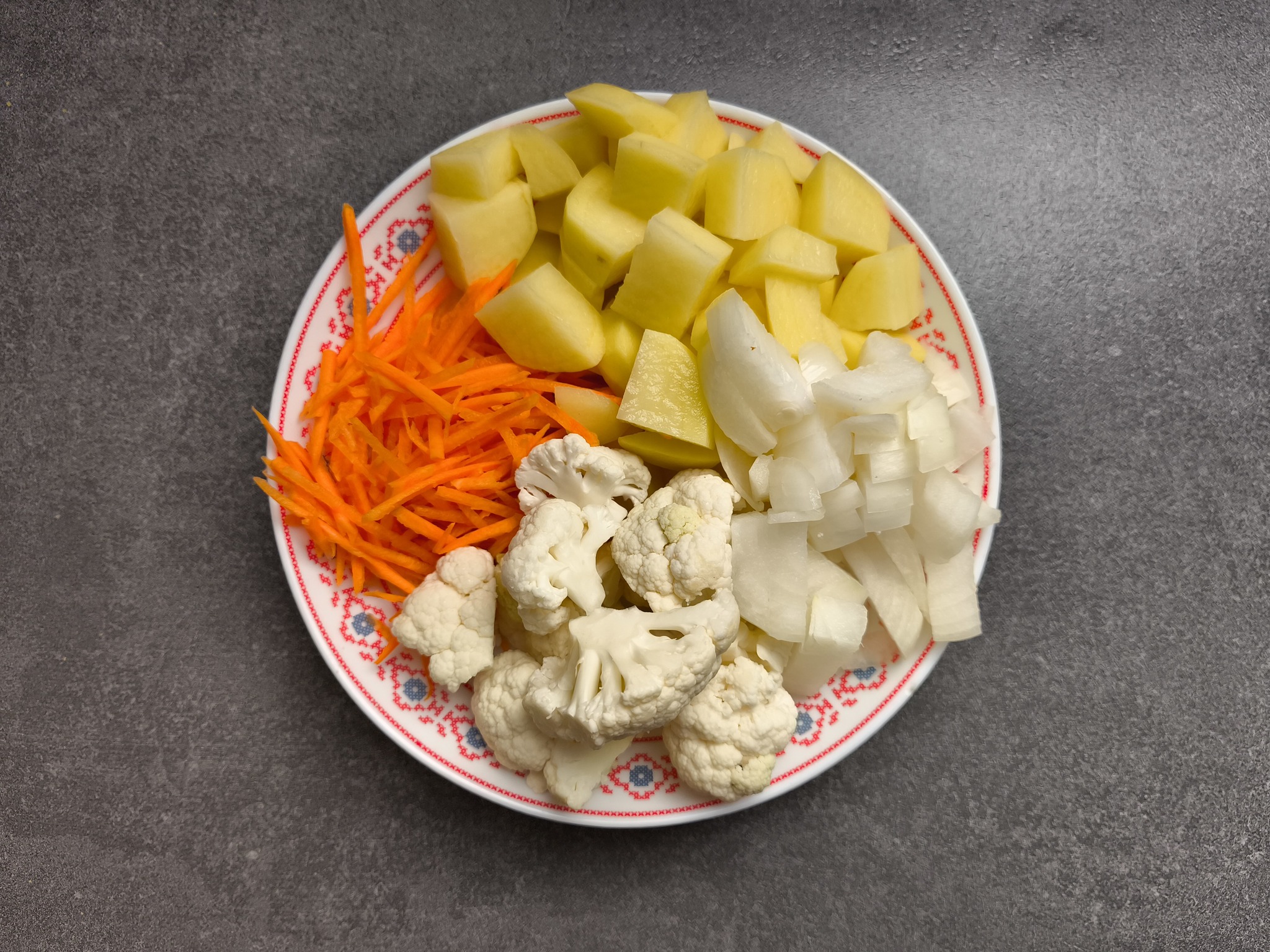 2. Лук (60 г), 1/3 морковки (60 г), цветную капусту (300-400 г) и картофель (300г) моем, чистим и режем как придется.