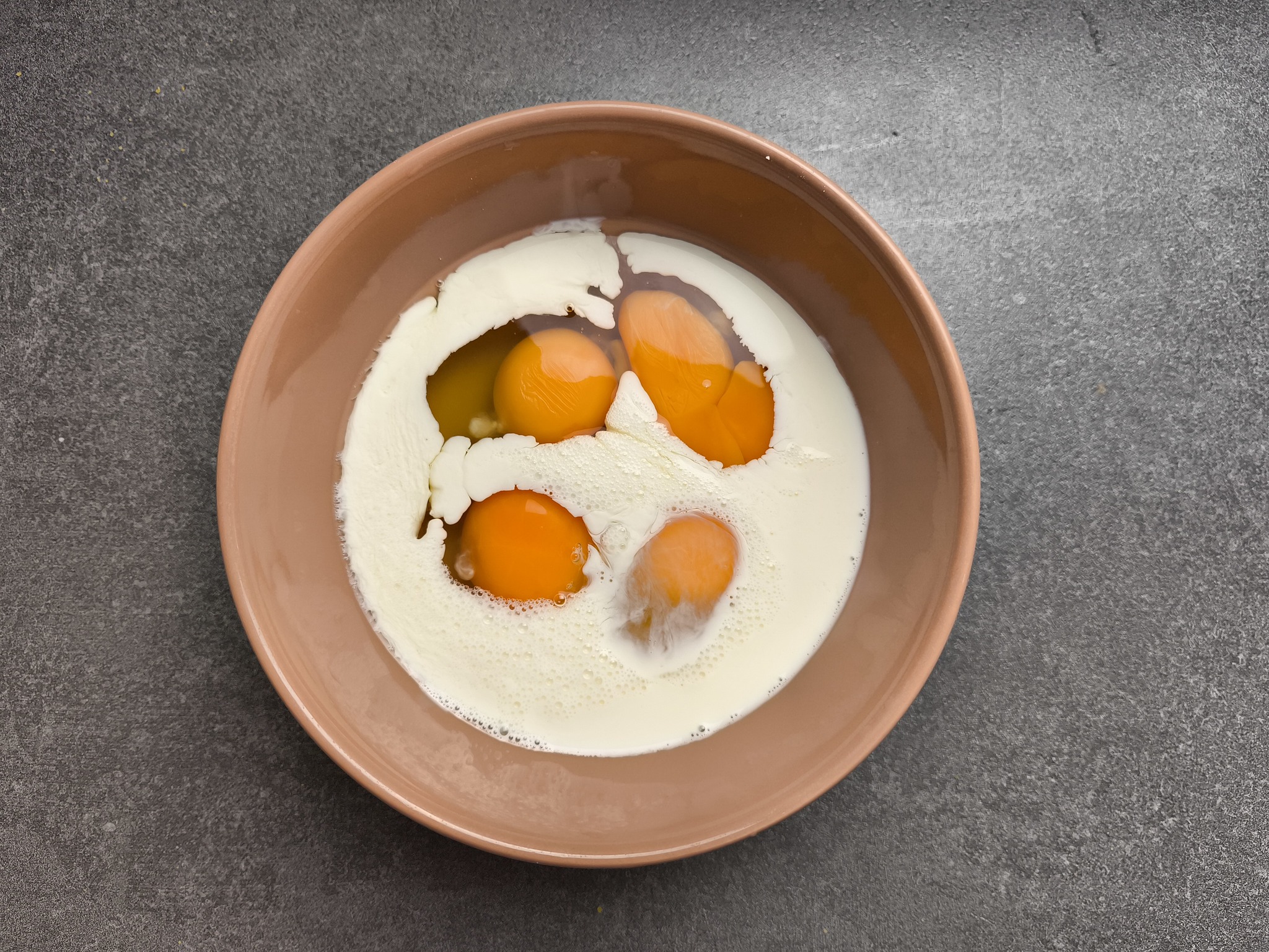 5. В мисочке делаем заливку: 4 яйца + 100 мл сливок. Вилкой взбиваем, соль, перец.