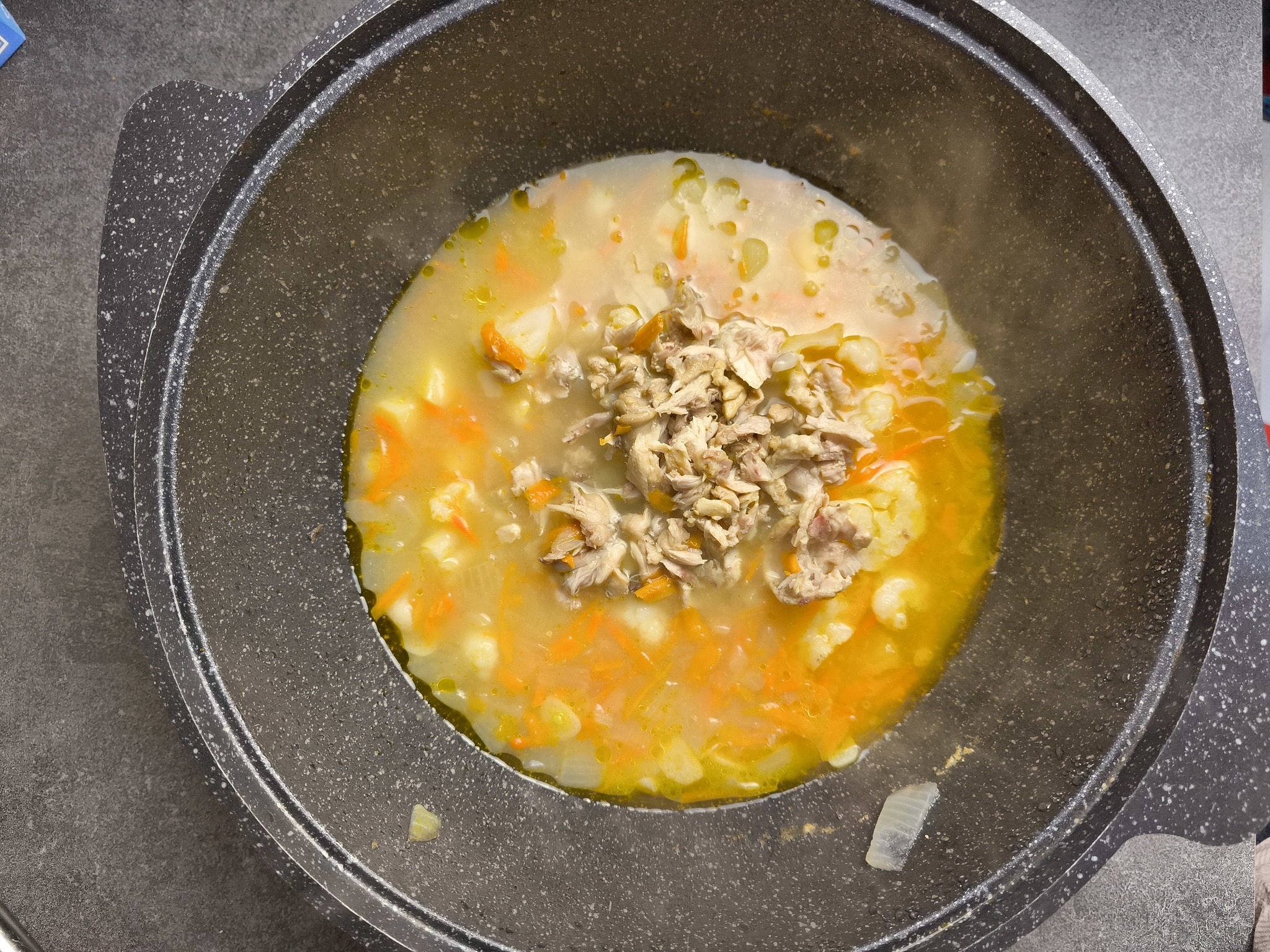 3. Вылавливаем кости, а бульон отправляем овощи, кроме капусты. Варим на среднем огне до готовности картофеля. Как картофель сварился - туда же цветную капусту. И ждем еще минут 5.