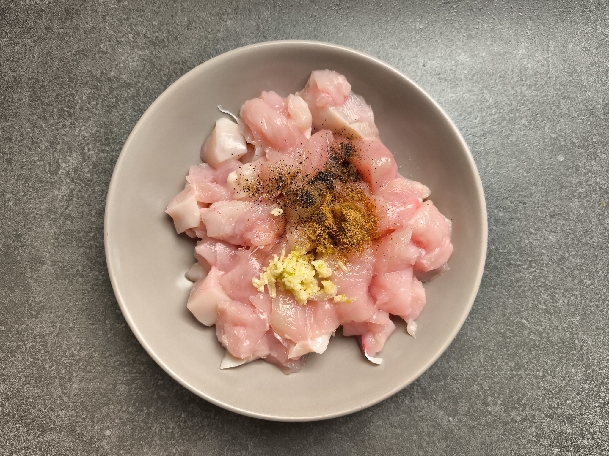 1. Куриное филе (у меня получилось 367 г) пилим на кубики, добавляем зубчик тертого чеснока, соль, перец, каплю растительного масла. Перемешиваем и пусть постоит.
