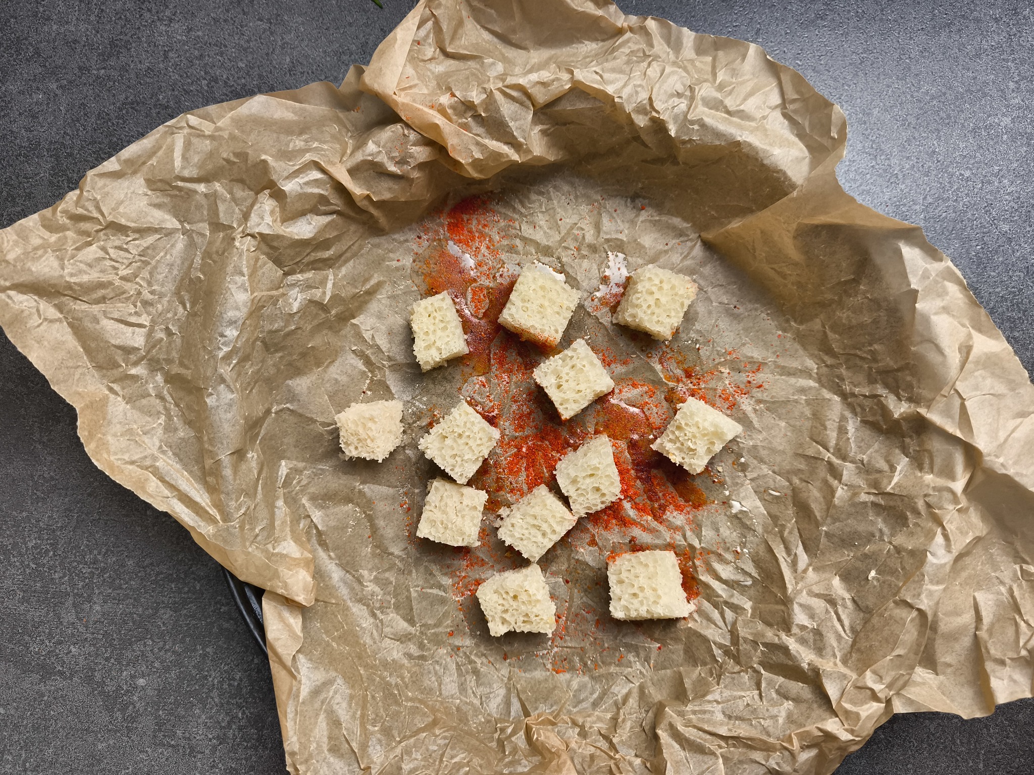 Срезаем с хлеба корку и пилим кубиками. На дно формы стелим бумагу для выпечки, смазываем маслом, соль, перец (у меня паприка) или любые любимые приправы. Выкладываем хлеб, перемешиваем. Будущие сухарики должны лежать в один слой.