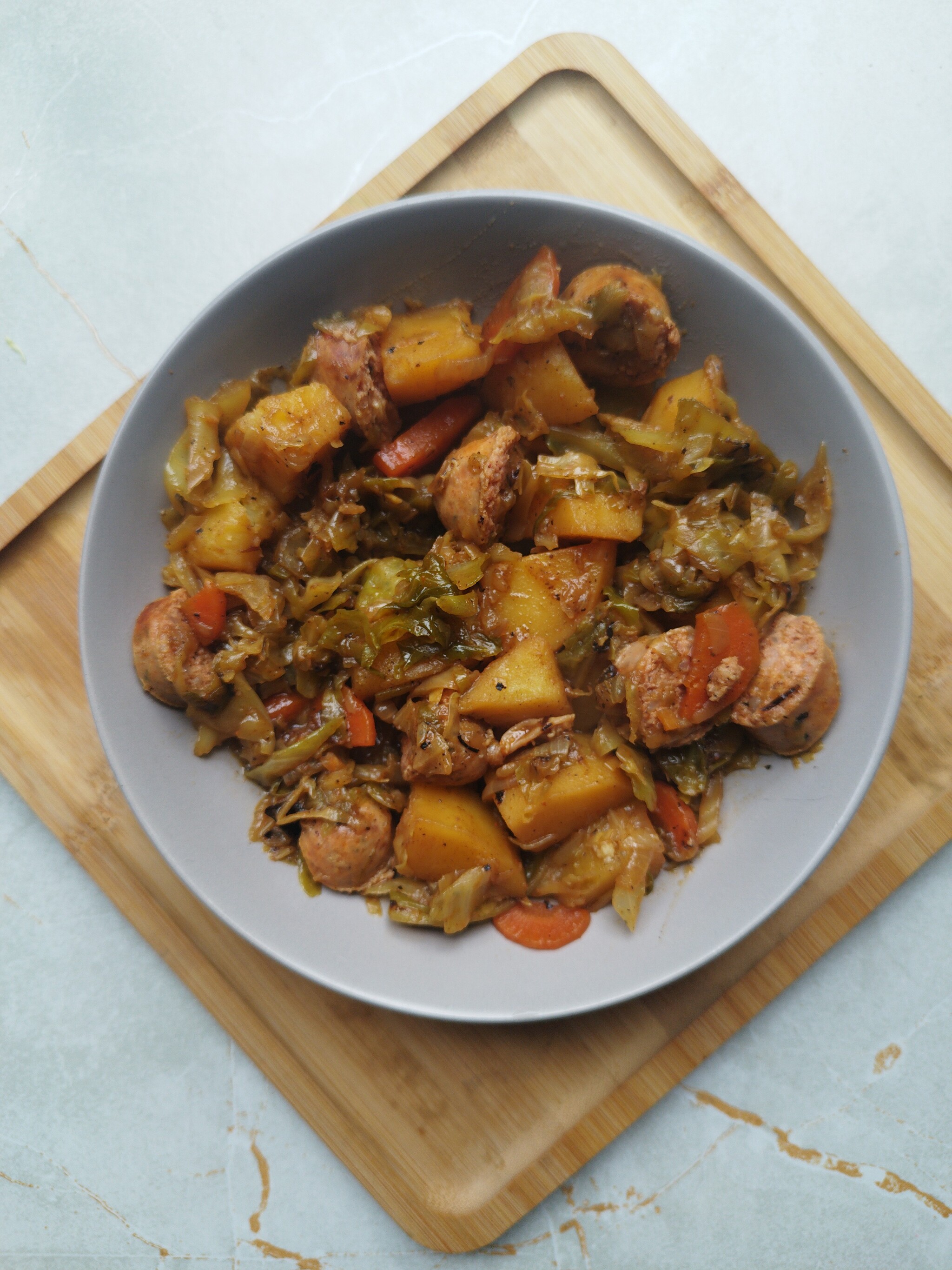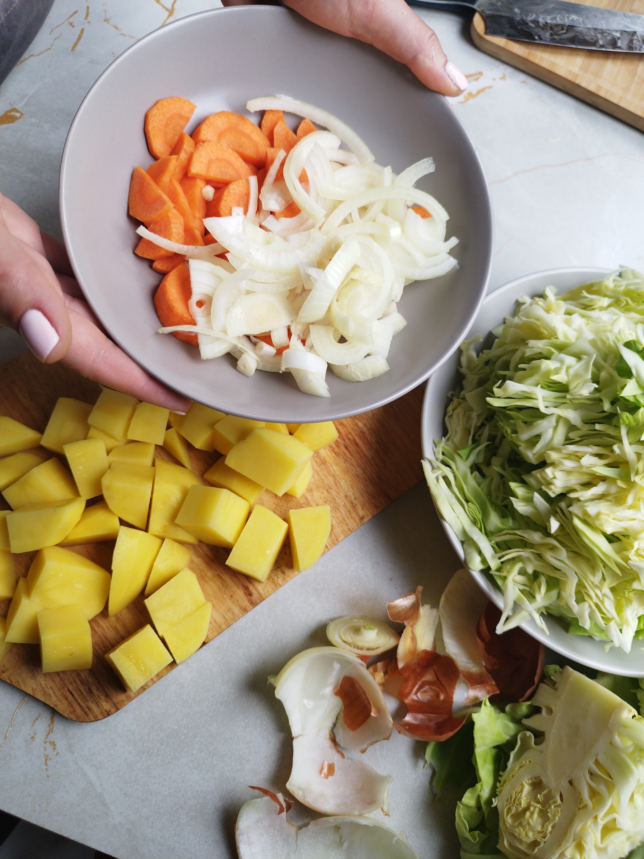2. Нарезаем овощи: капусту тоненько, лук - полукольцами, морковь - как придётся, картофель - кубиками.