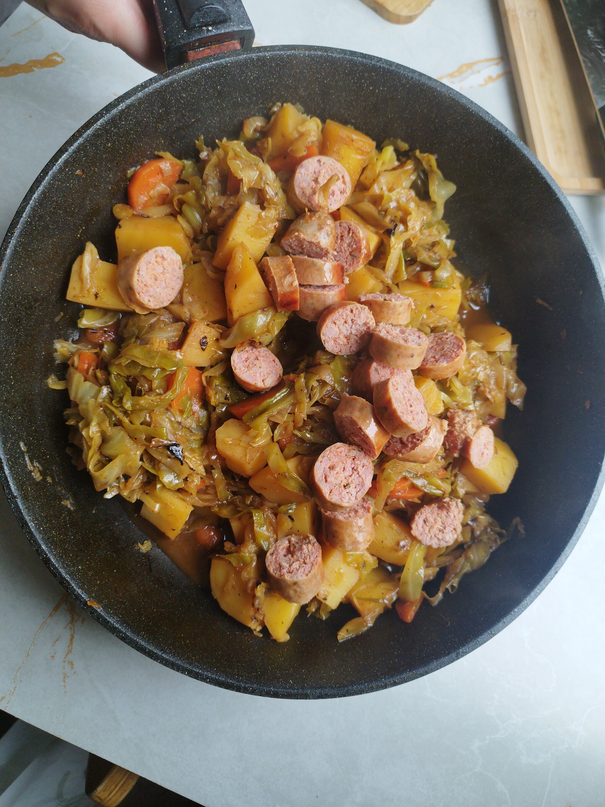 5. Купаты нарезаем кружочками, возвращаем в сковороду, прогреваем. В конце добавляем зубчик измельчённого чеснока.