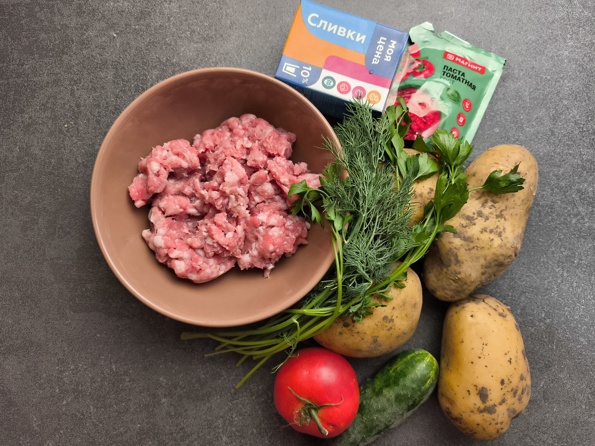 У меня сейчас времени в обрез, поэтому готовим легкий т быстрый обед - картофельное пюре с фрикадельками в томатно-сливочном соусе.