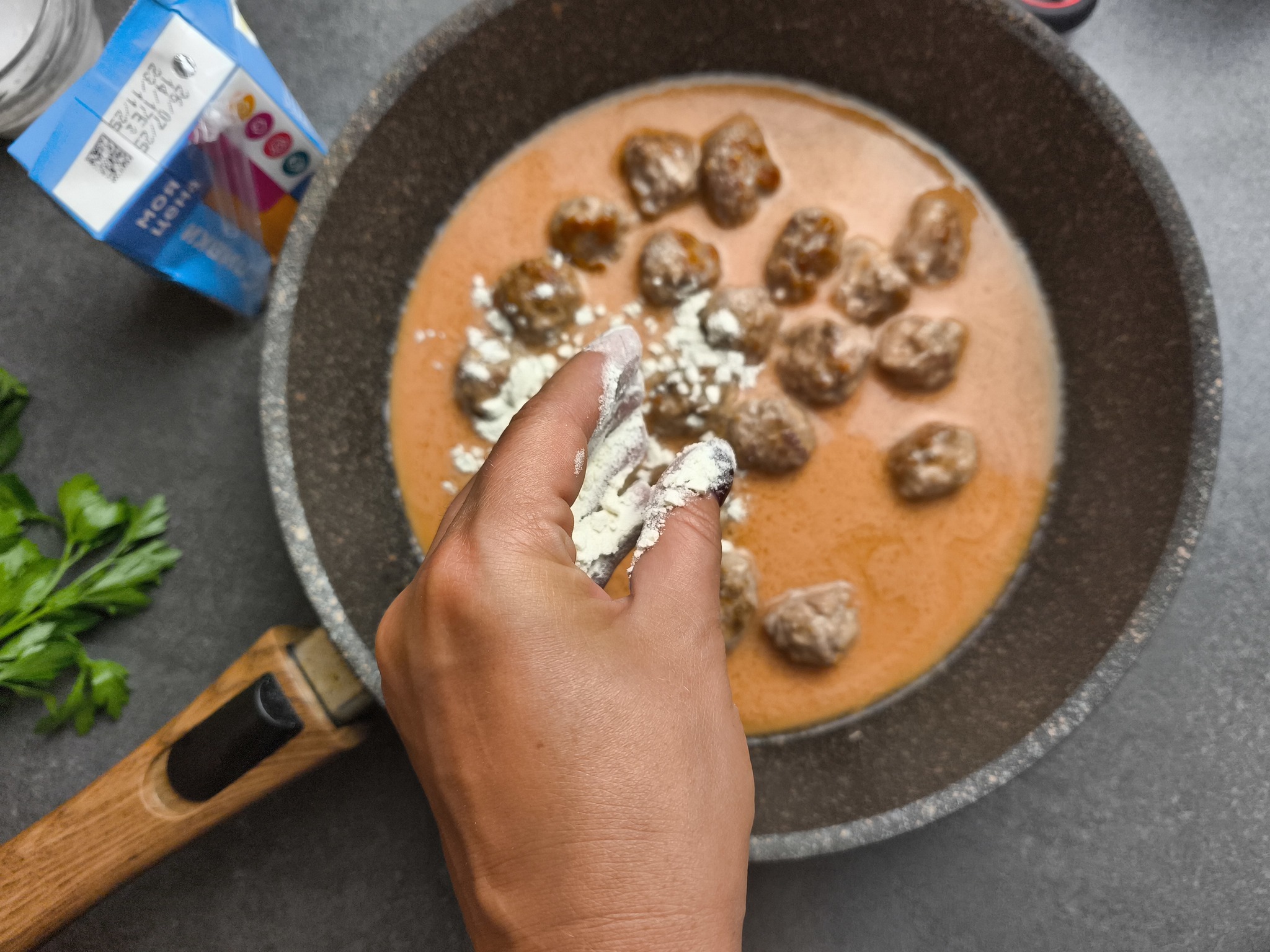 6. Загущаем соус щепоткой муки. Прогреваем еще пару минут. Соль, перец.