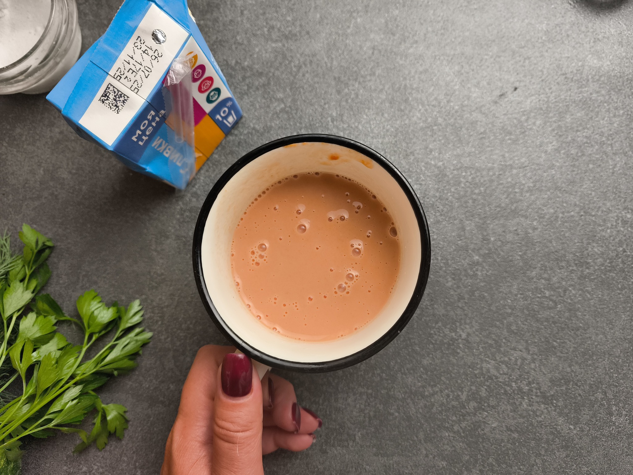 4. В кружке смешиваем 100 мл сливок, 70 гр томатной пасты, добавляем еще немного воды для объема. Я добавила около 100 мл.
