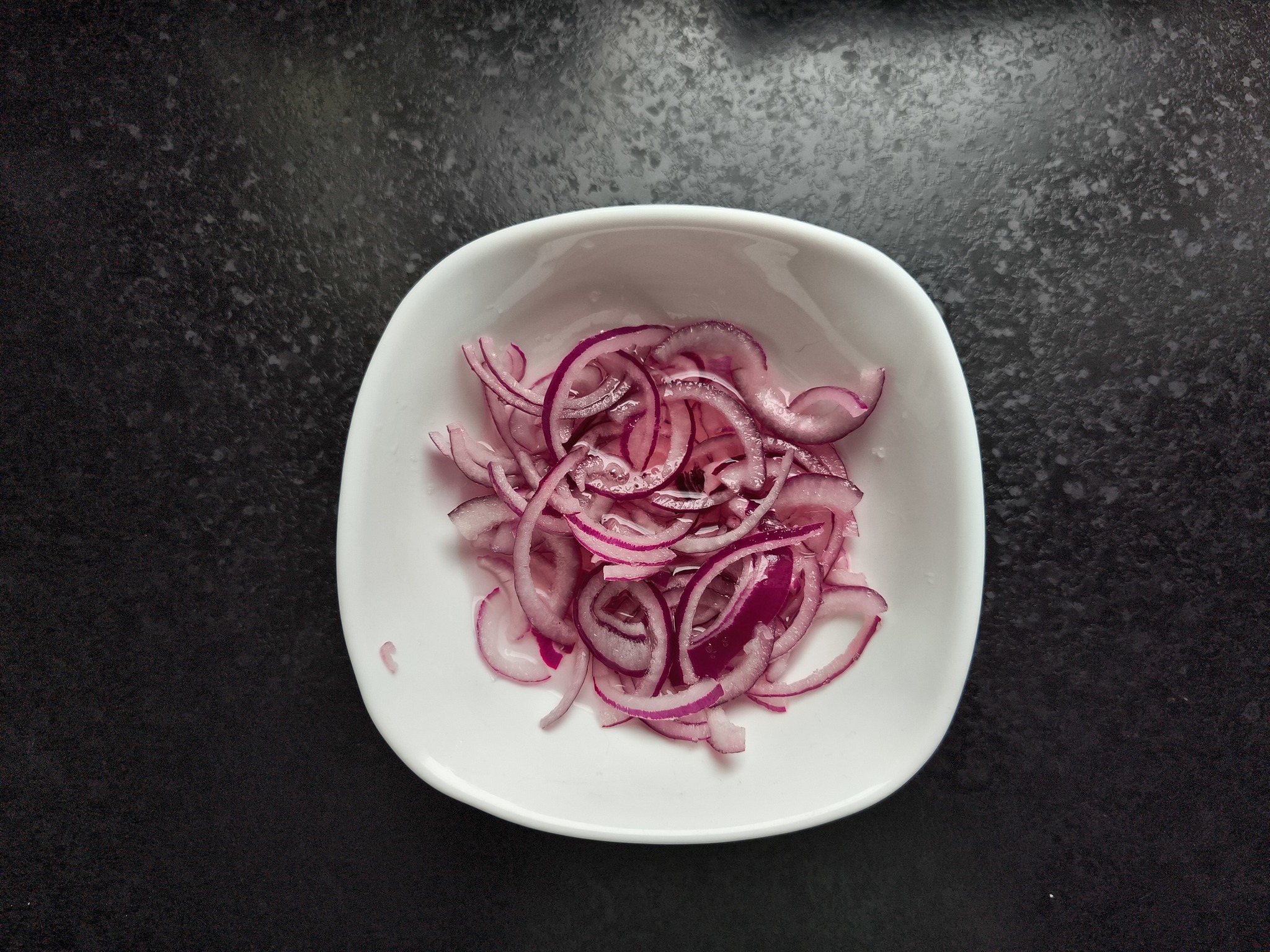 1. Лук режем тонкими полукольцами, добавляем пол ст. ложки сахара, 1 ст. л уксуса и 2 ст.л. горячей воды. Пусть стоит маринуется