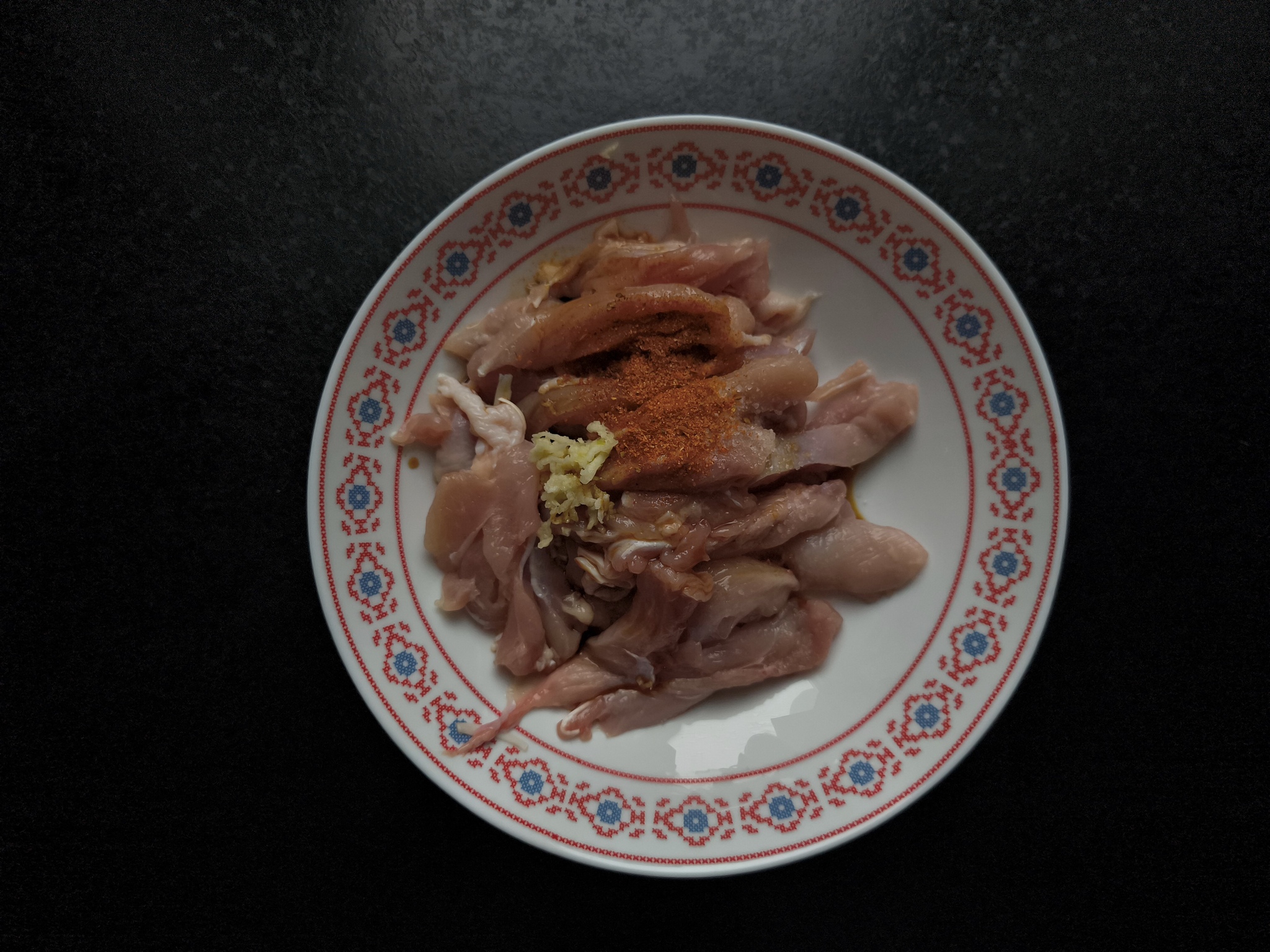 4. Пилим мяско на длинные полосочки или как будет удобно. Добавляем соль, паприку, 1 зубчик чеснока и 1 ст. л. соевого соуса. Обжариваем куриные кусочки на небольшом количестве растительного масла.