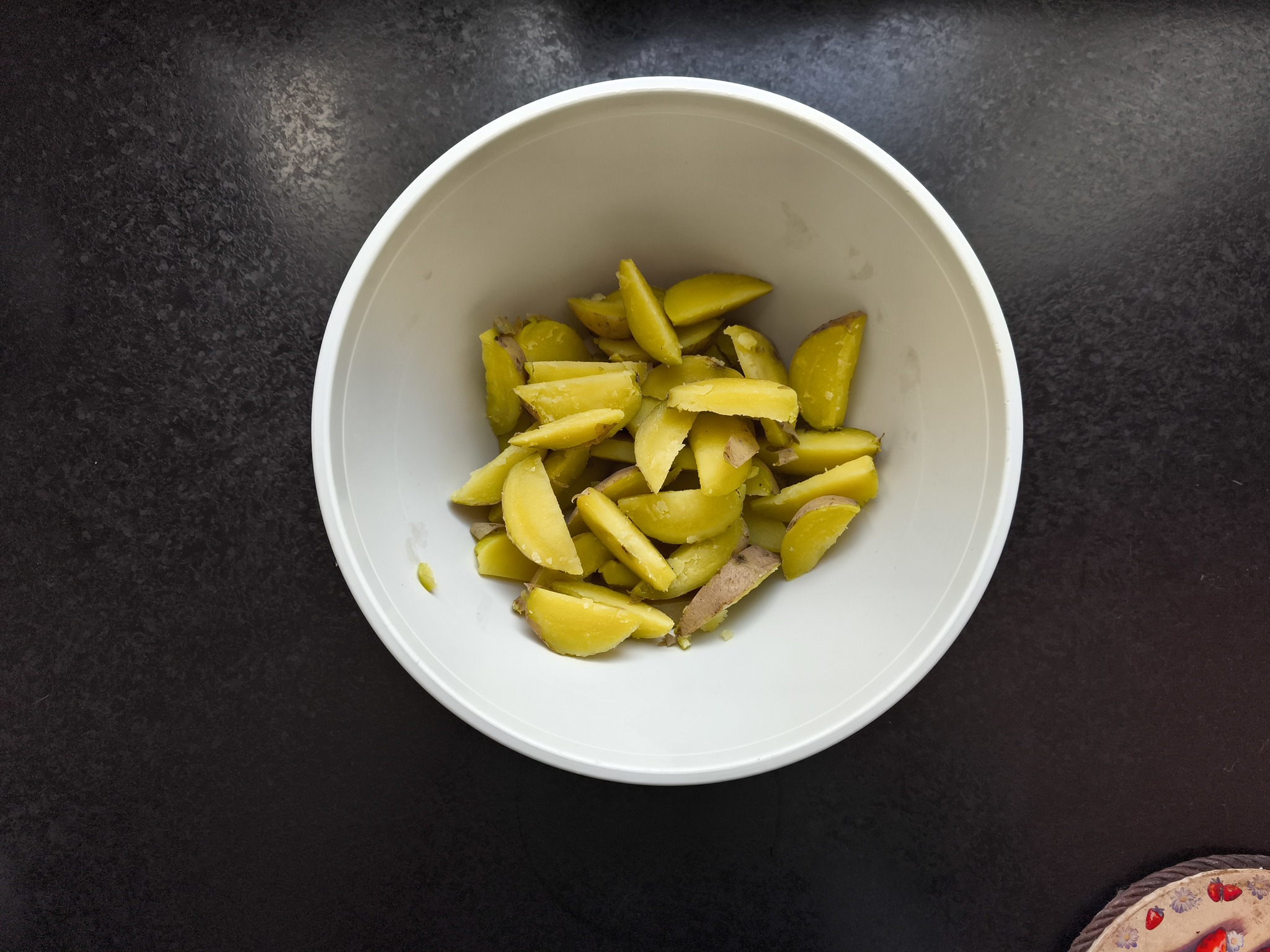 6. Теперь сливаем воду с картофеля, даём чуть остыть, но не полностью. Картошка должна оставаться горячей. И режем дольками.