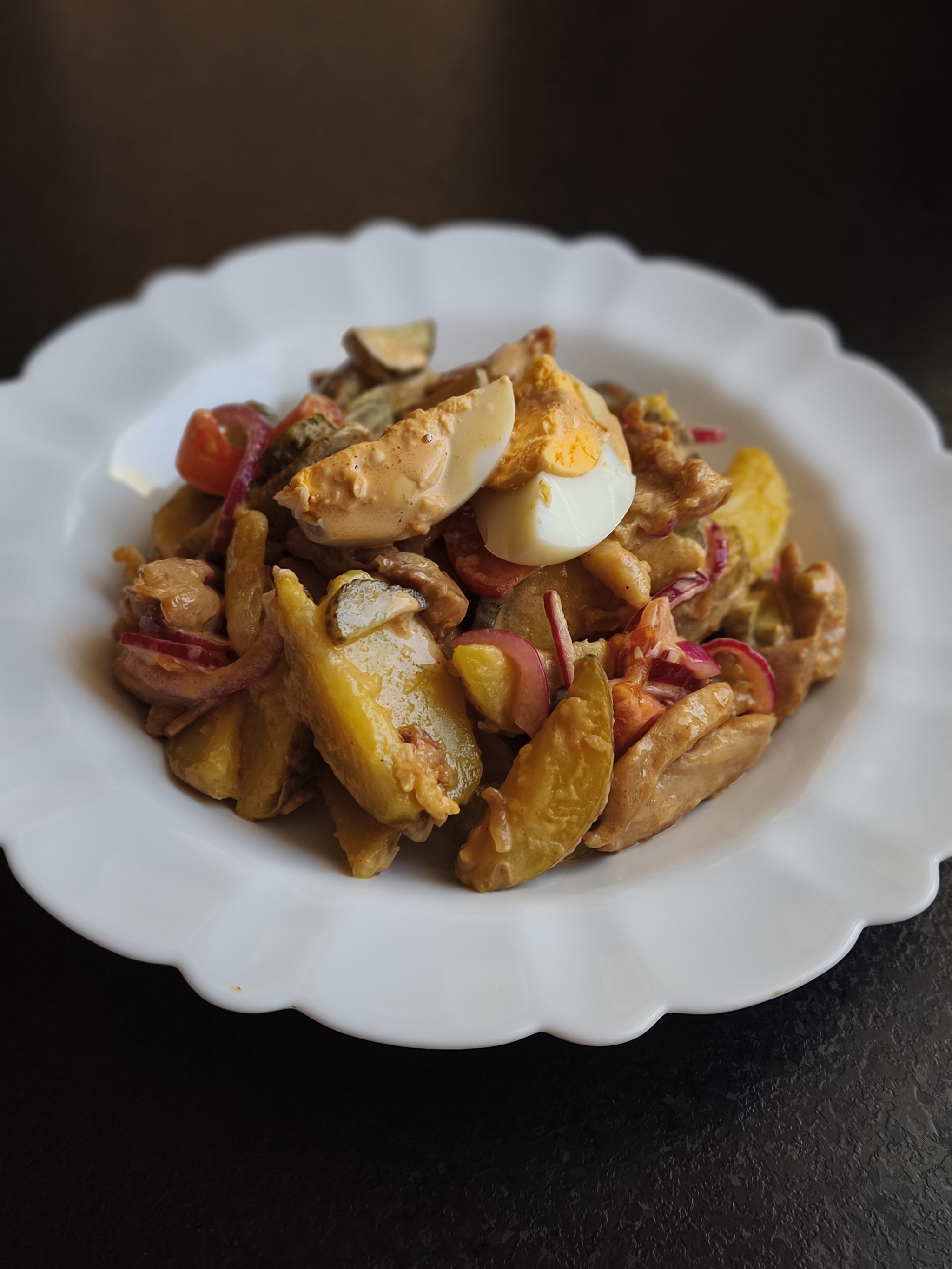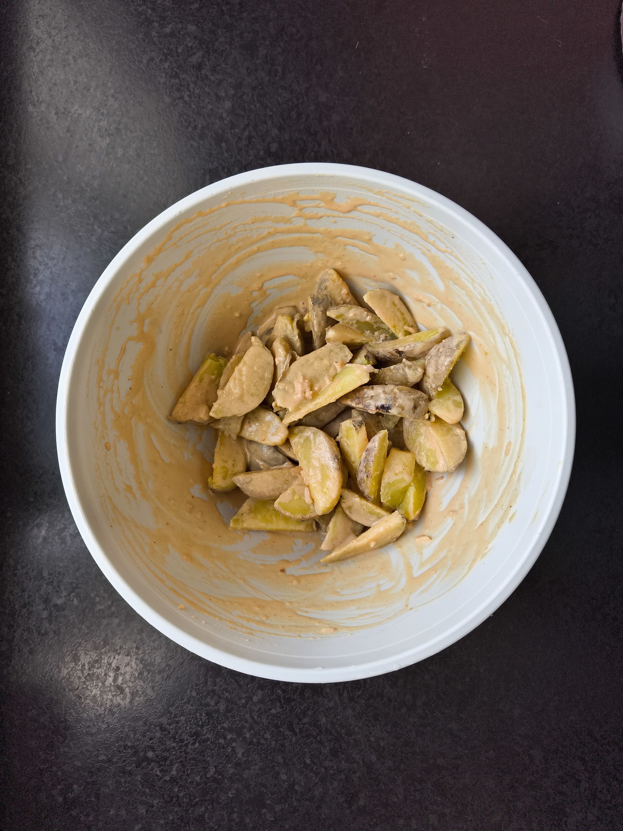 8. Выливаем половину заправки в картошку, перемешиваем и даем постоять 5 мин. Пусть оно там подружится с горячей картохой.