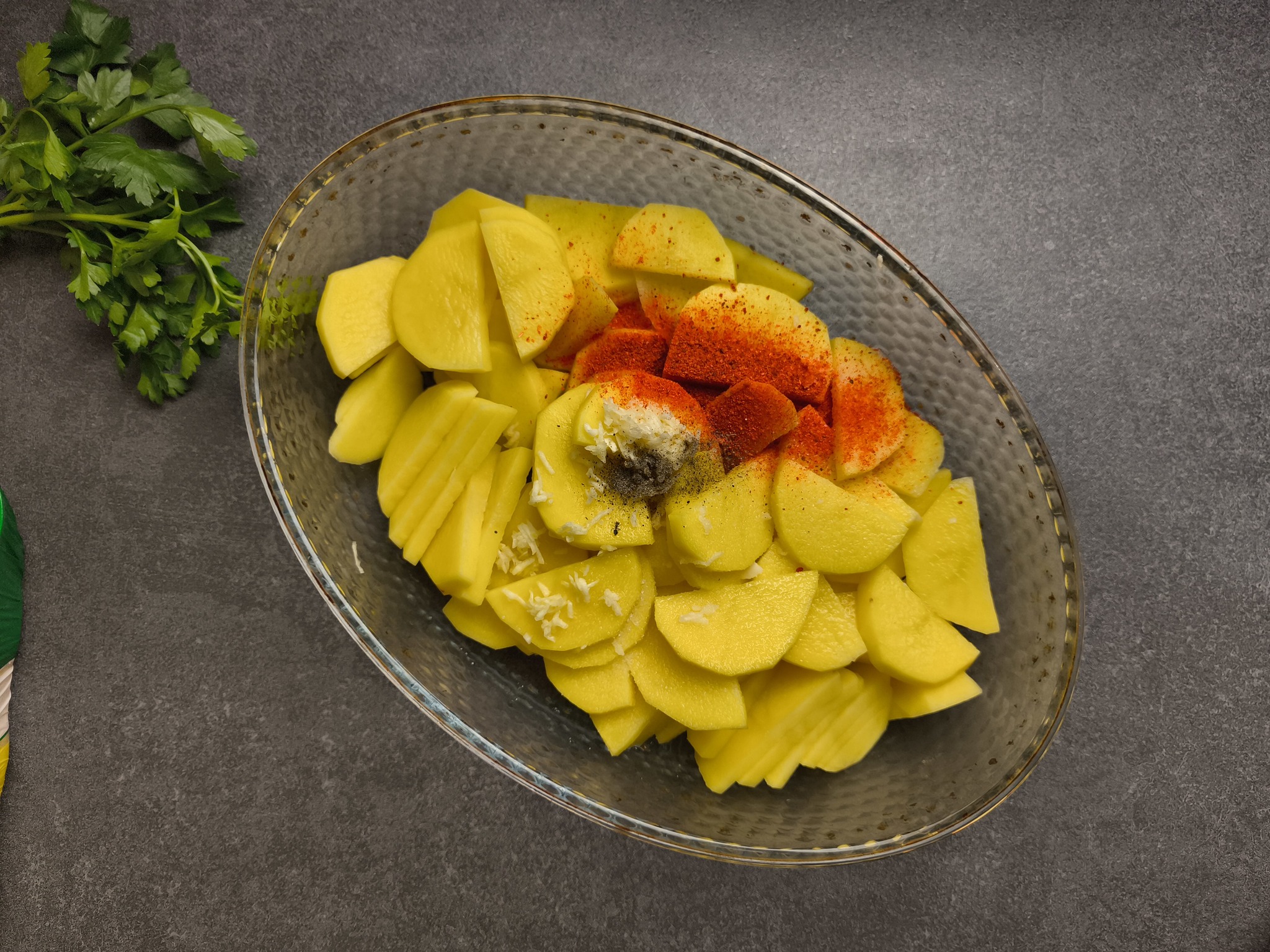2. Картофель чистим, режем пополам и пилим тонкими пластинами. Туда же соль, перец, немного растительного масла, пару зубчиков давленного чеснока. И прямо в форме для запекания перемешиваем хорошенько.