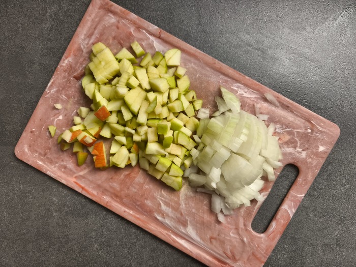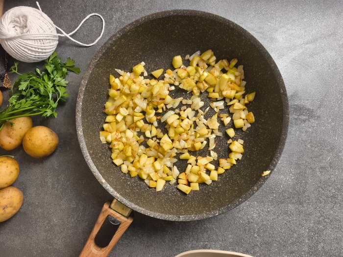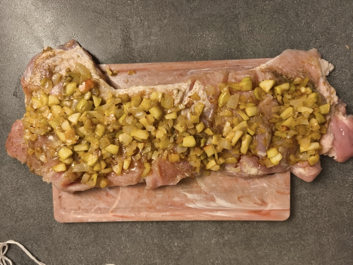 5. Раскладываем начинку ровным слоем по куску свинины.