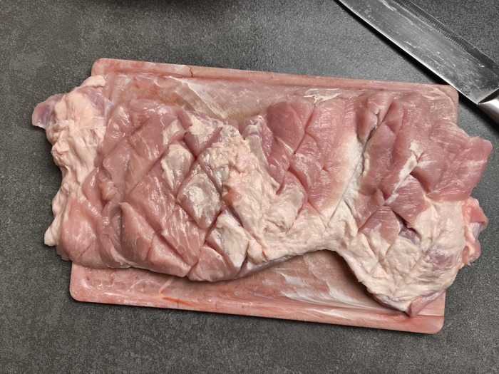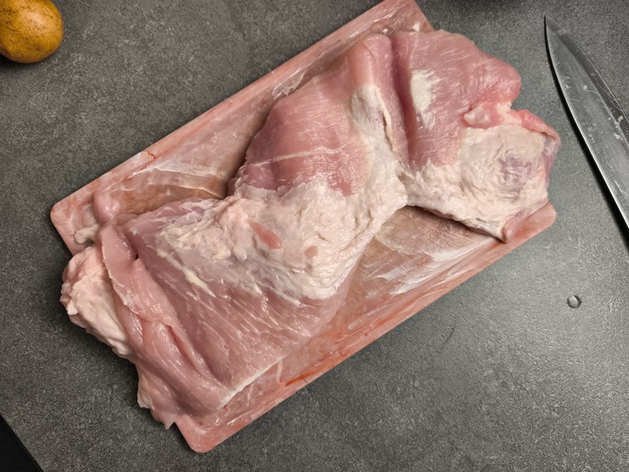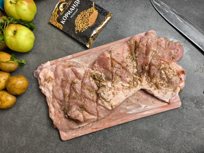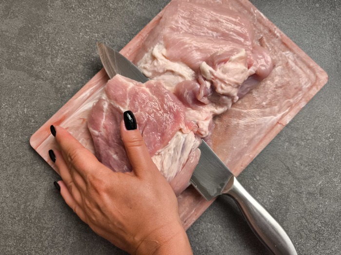 1. Берем кусочек свинины и разрезаем его от середины в 2 стороны, не доходя до конца. Кусочек мяса должен раскрыться в 2 стороны.
